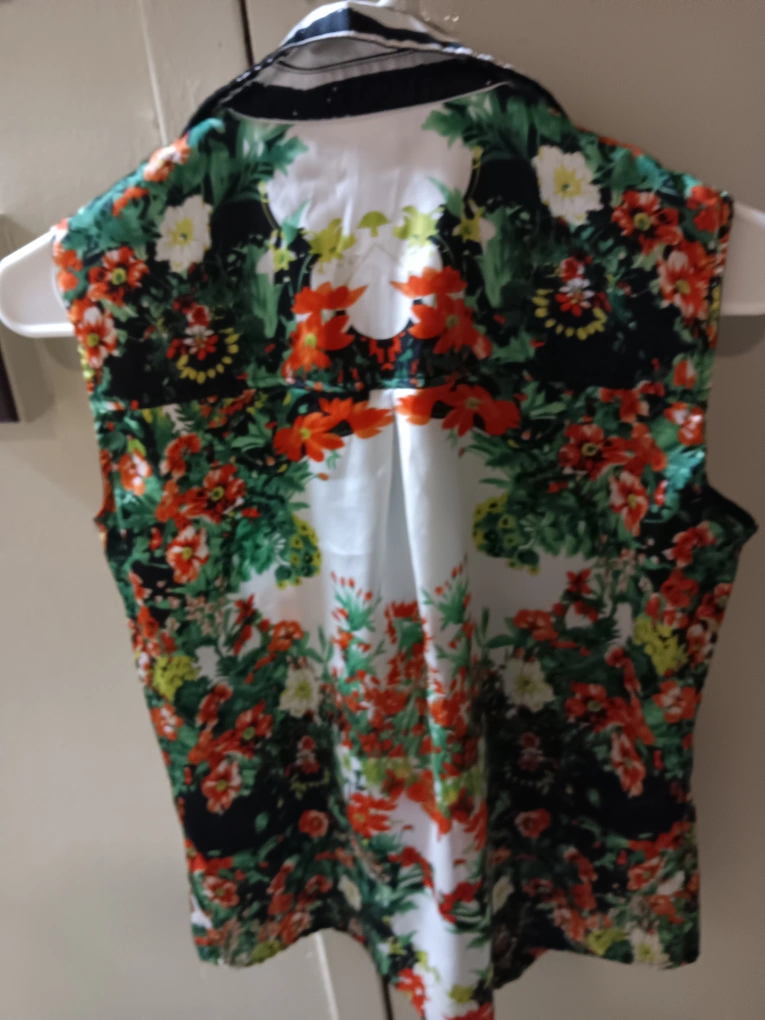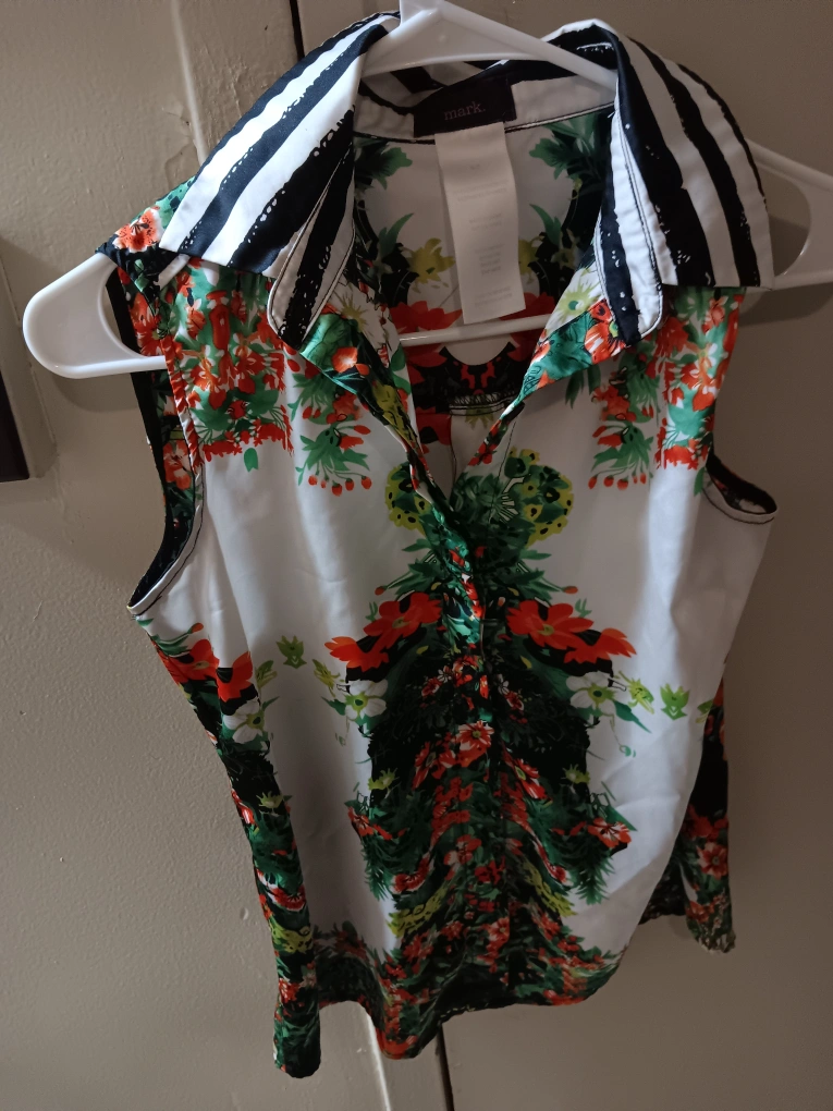 This is a Mark sleeveless blouse with a vibrant floral pattern. It features a black and white striped collar and button-down front. The material feels silky and lightweight, making it perfect for warmer weather. It's in great condition!