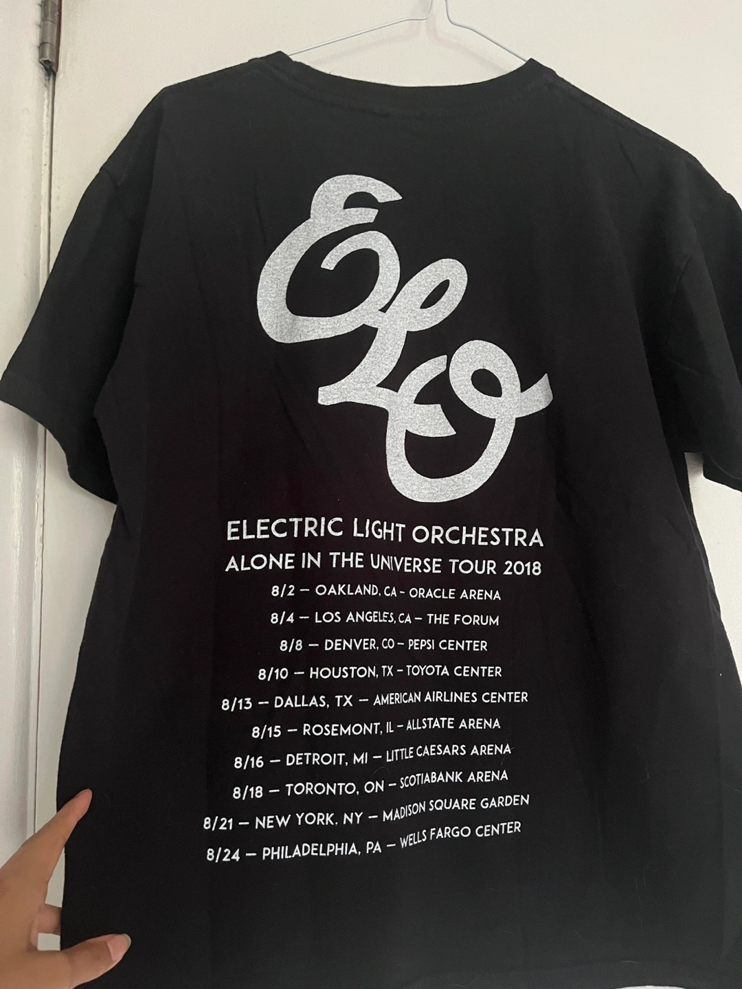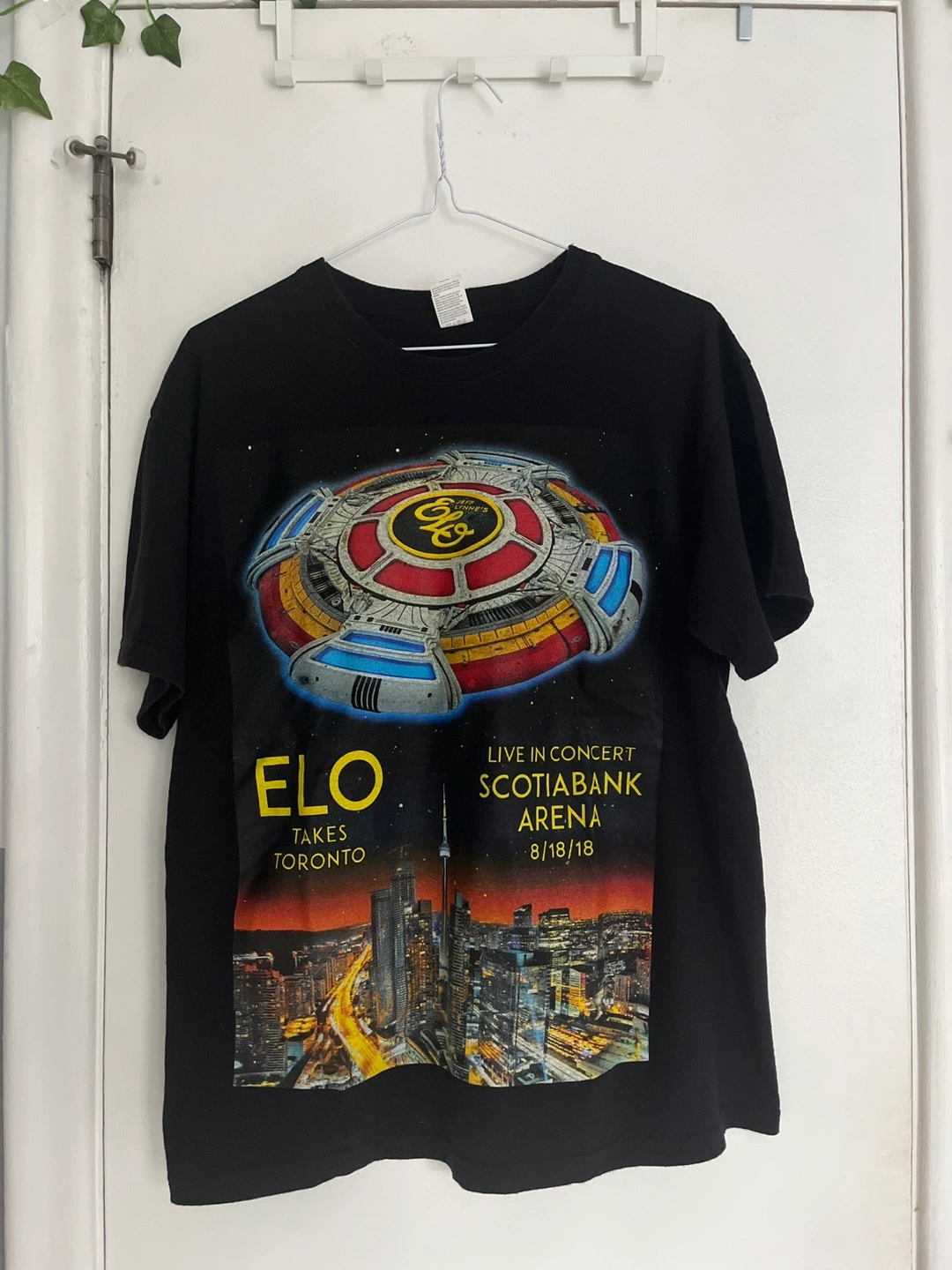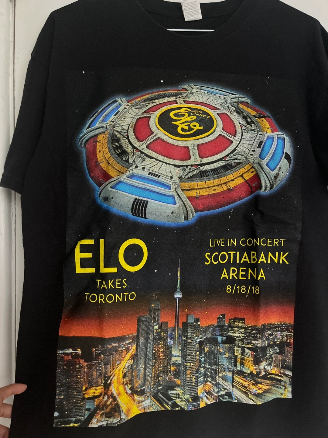 Selling a black ELO (Electric Light Orchestra) concert t-shirt, size M. The shirt commemorates their Toronto show on August 18, 2018. It features an incredible graphic on the front and tour dates on the back.