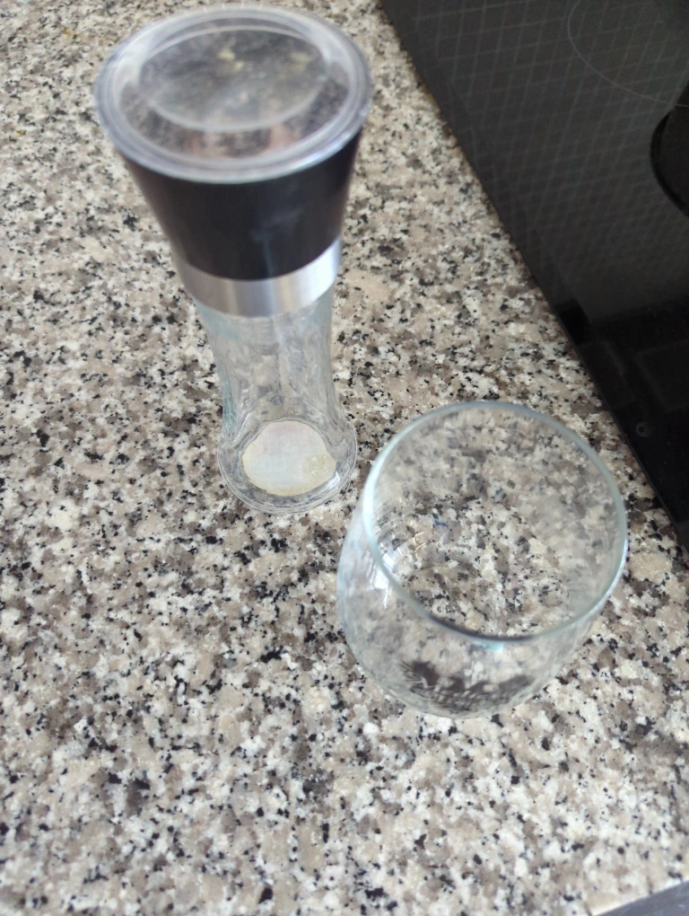 Selling a salt or pepper grinder with a clear glass body and black top. Also included is a glass, perfect for any beverage