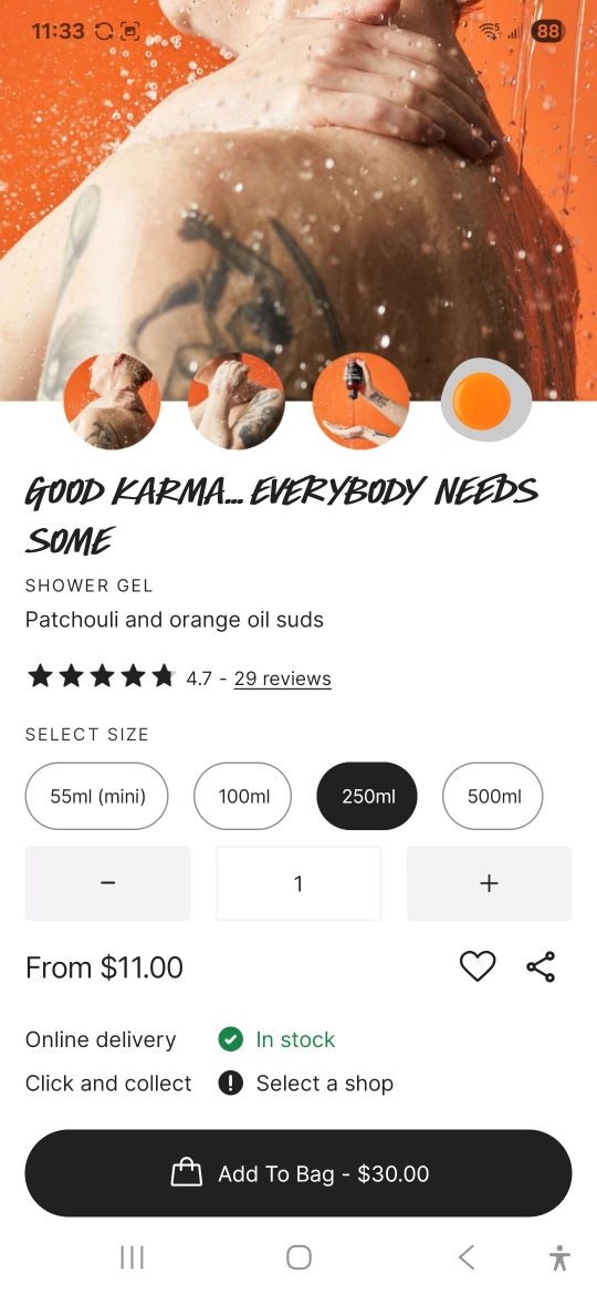 84Selling a bottle of Lush Good Karma shower gel. It's the 250ml size and features a lovely patchouli and orange oil scent. The original online price is $30