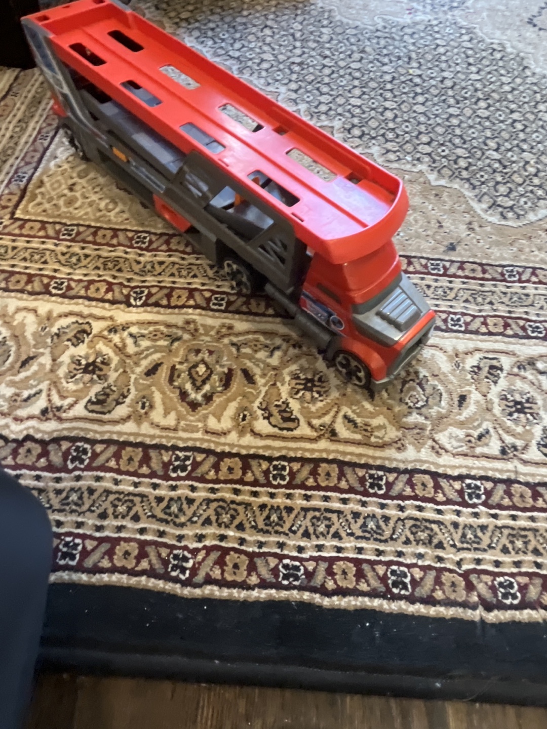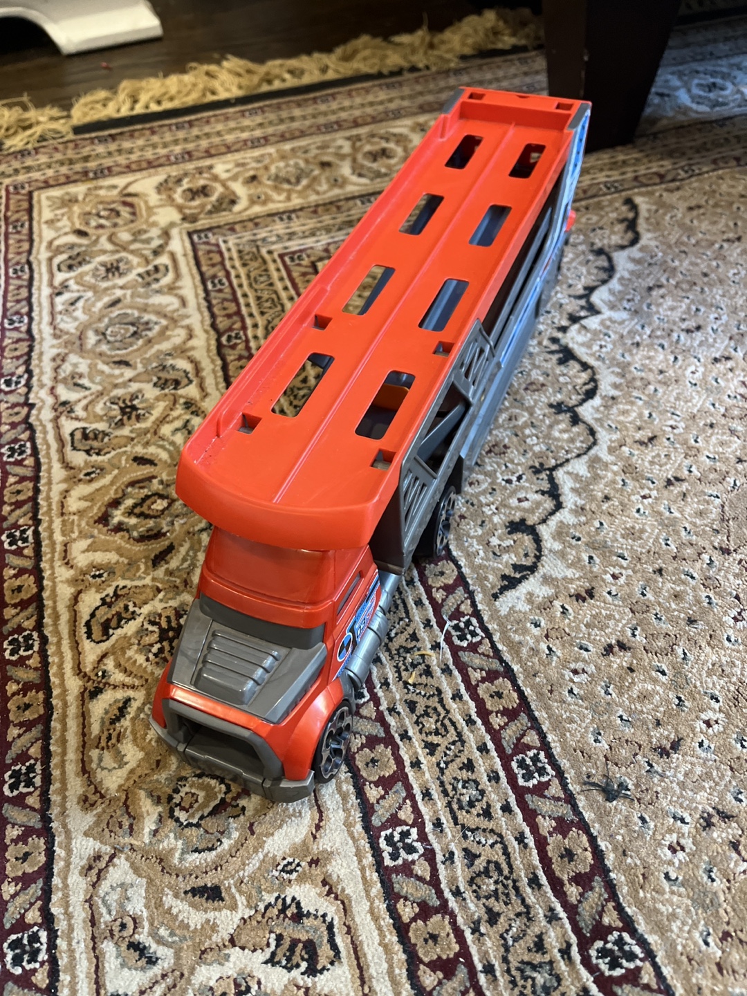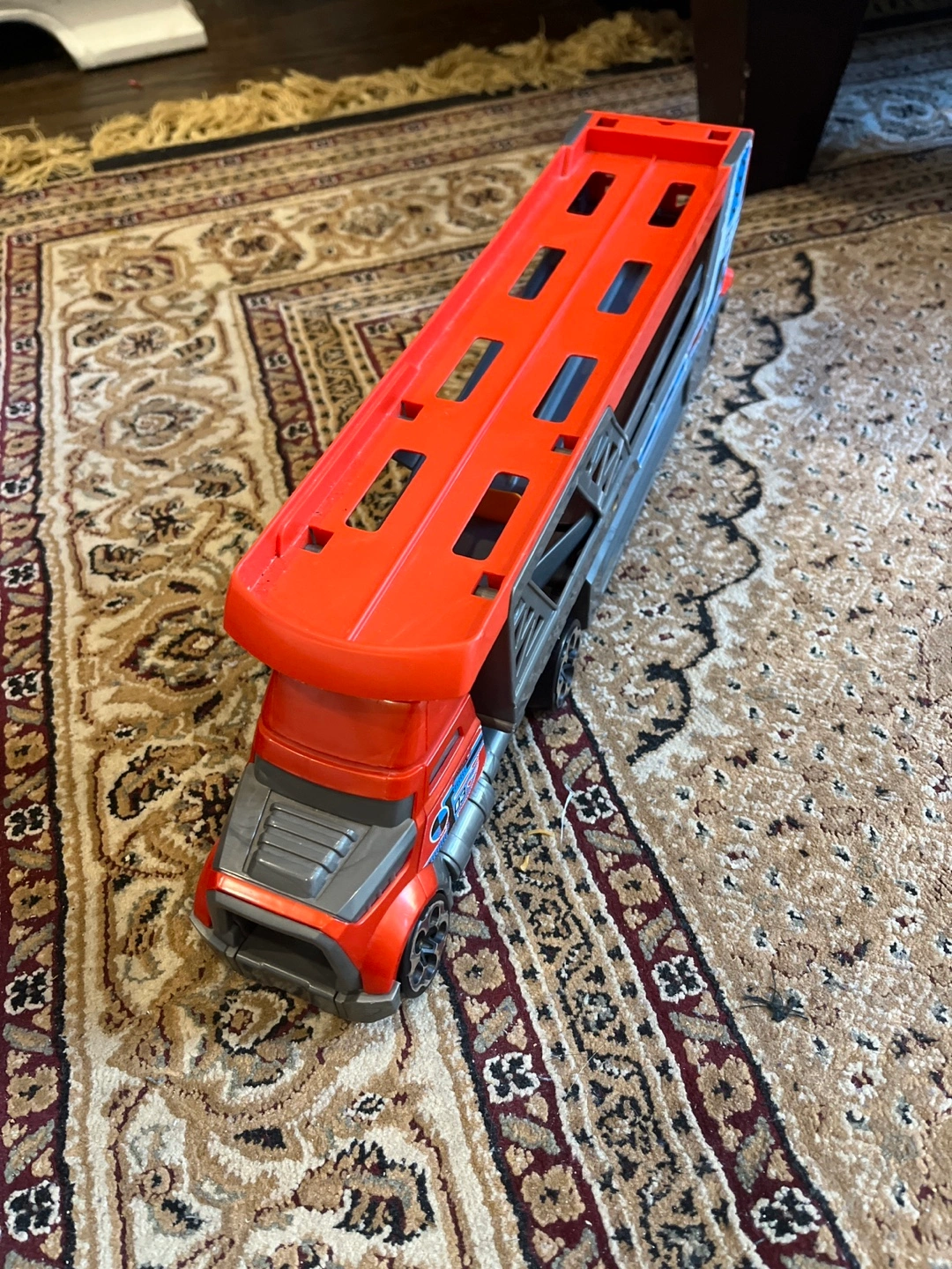 I'm selling a toy car carrier truck. It's in great condition and ready for a new home! It's perfect for kids who love cars and trucks
