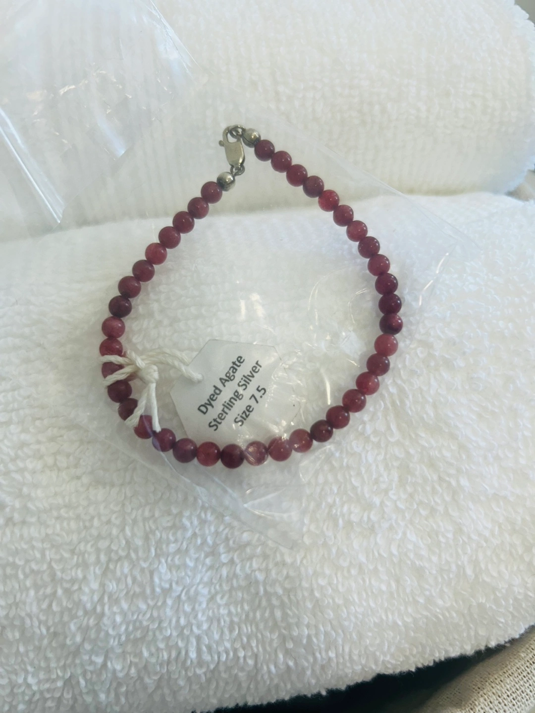 Selling agate bracelet with sterling silver accents. Stamped 925 on clasp. It's size 7.5 and comes in a protective bag. Agate is believed to promote emotional balance and harmony, while easing stress and negative energies. It's associated with the heart chakra, enhancing self-love, confidence, and a nurturing connection to the divine feminine