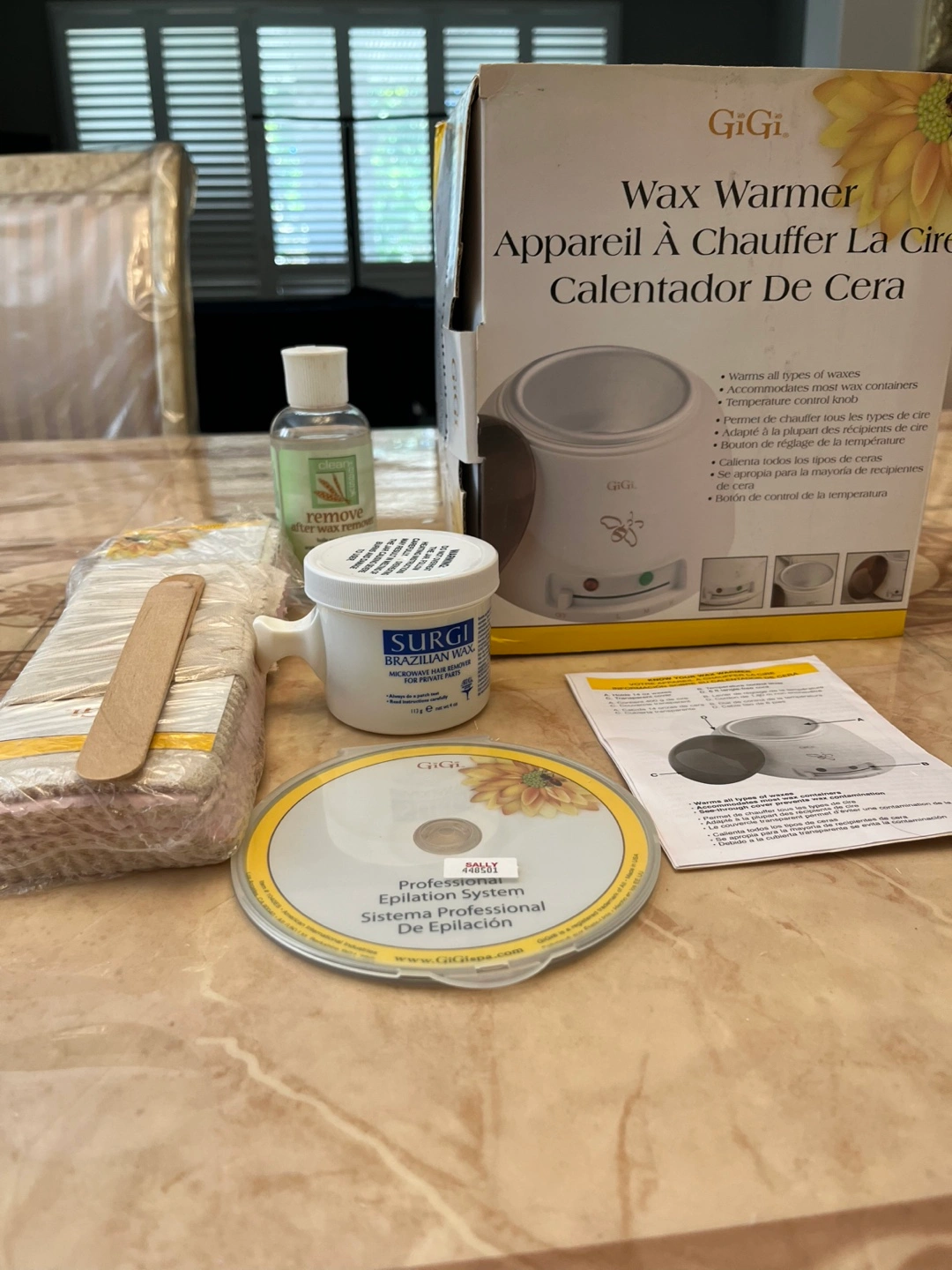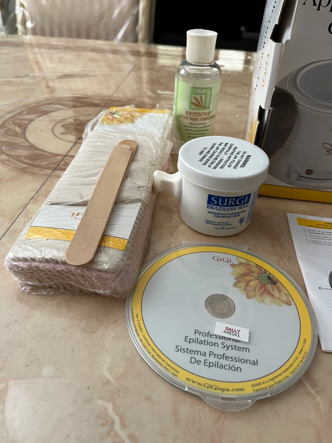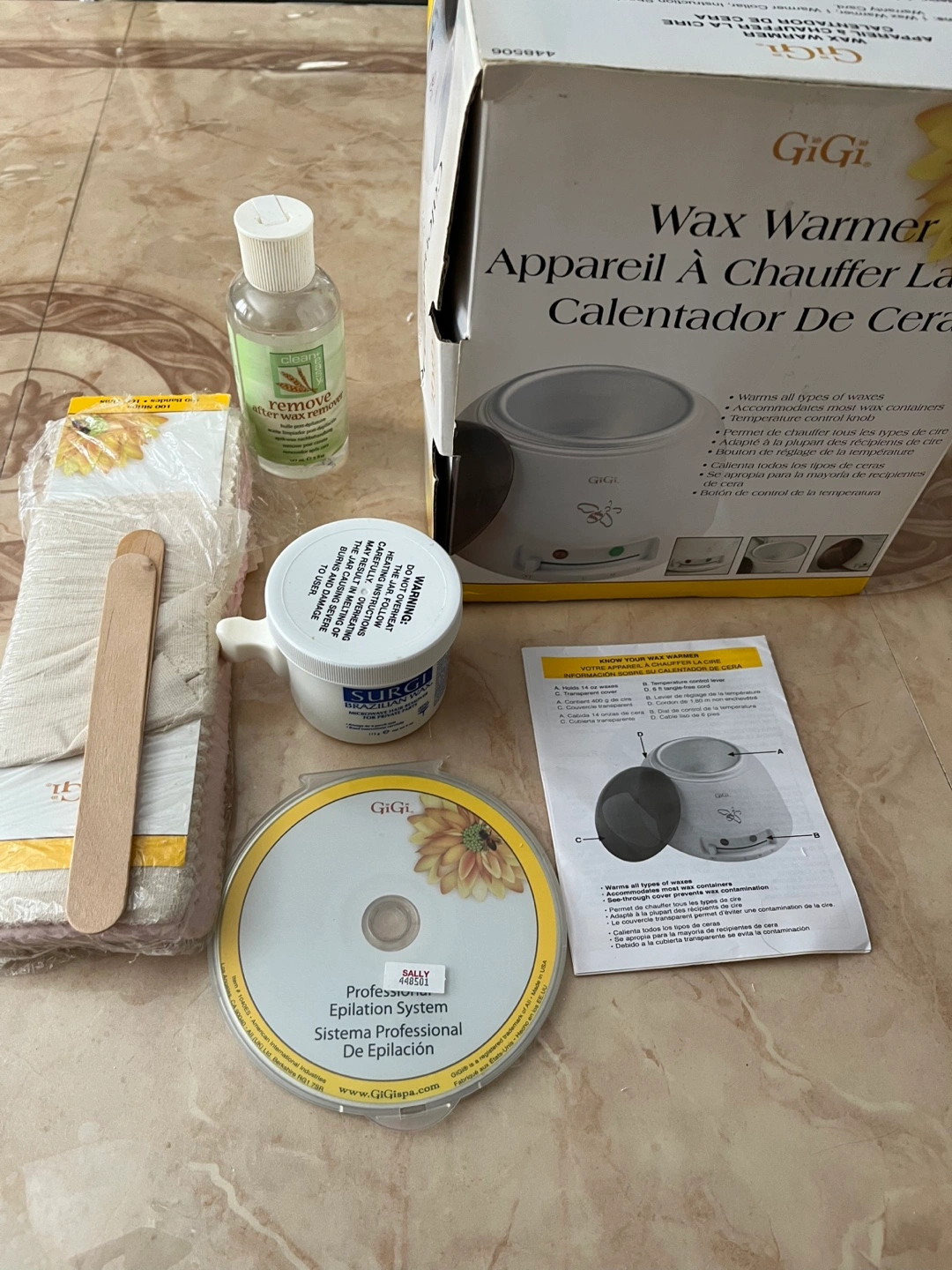 It comes with everything you need for waxing at home. Included in the kit are the wax warmer itself, SURGI Brazilian wax, GiGi remove after wax treatment, cotton wax strip, applicator sticks, epilation system CD, and the original box.
