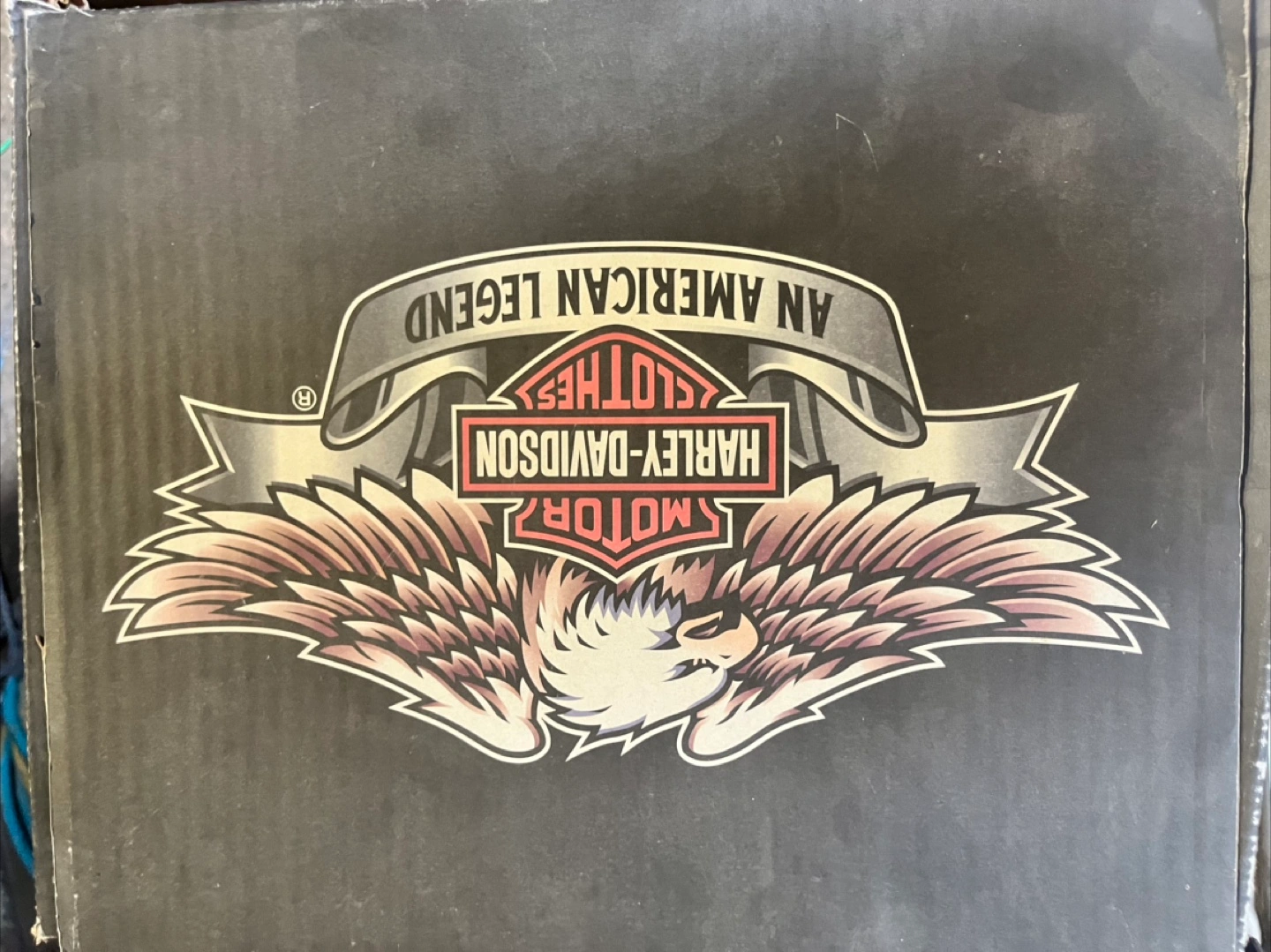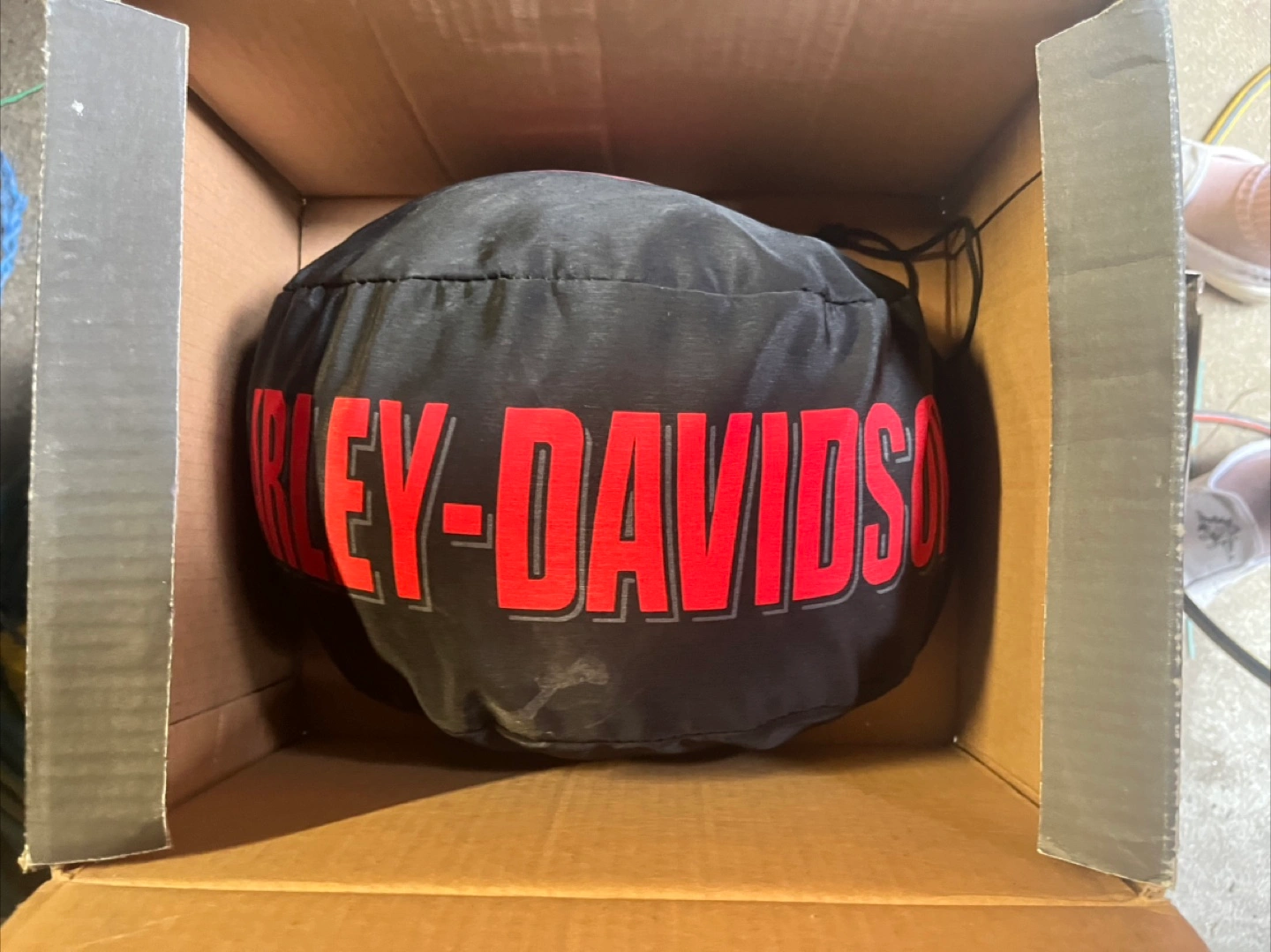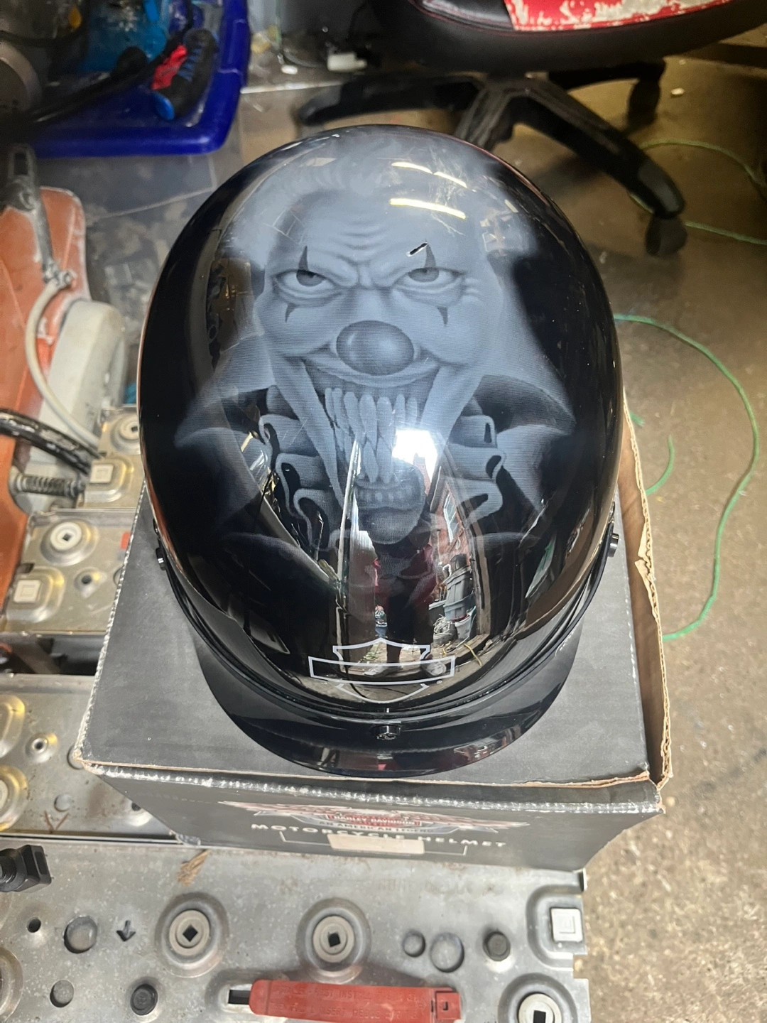 Selling an awesome Harley-Davidson helmet in size small. It comes with the original box. The helmet is black and has a clown design on it.
