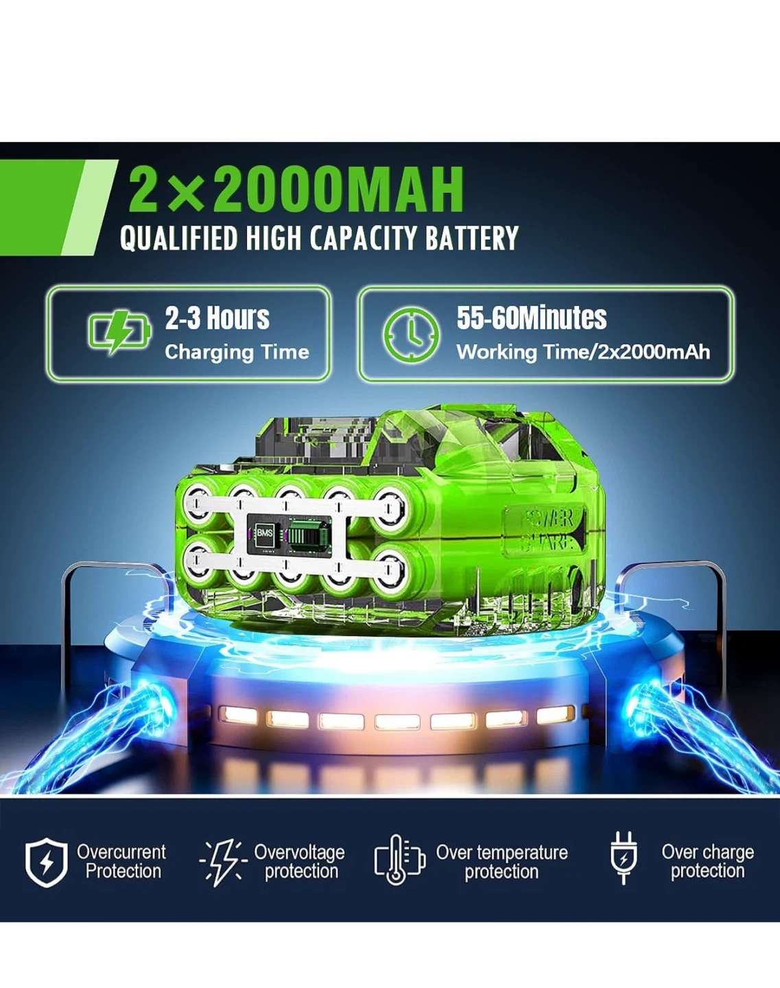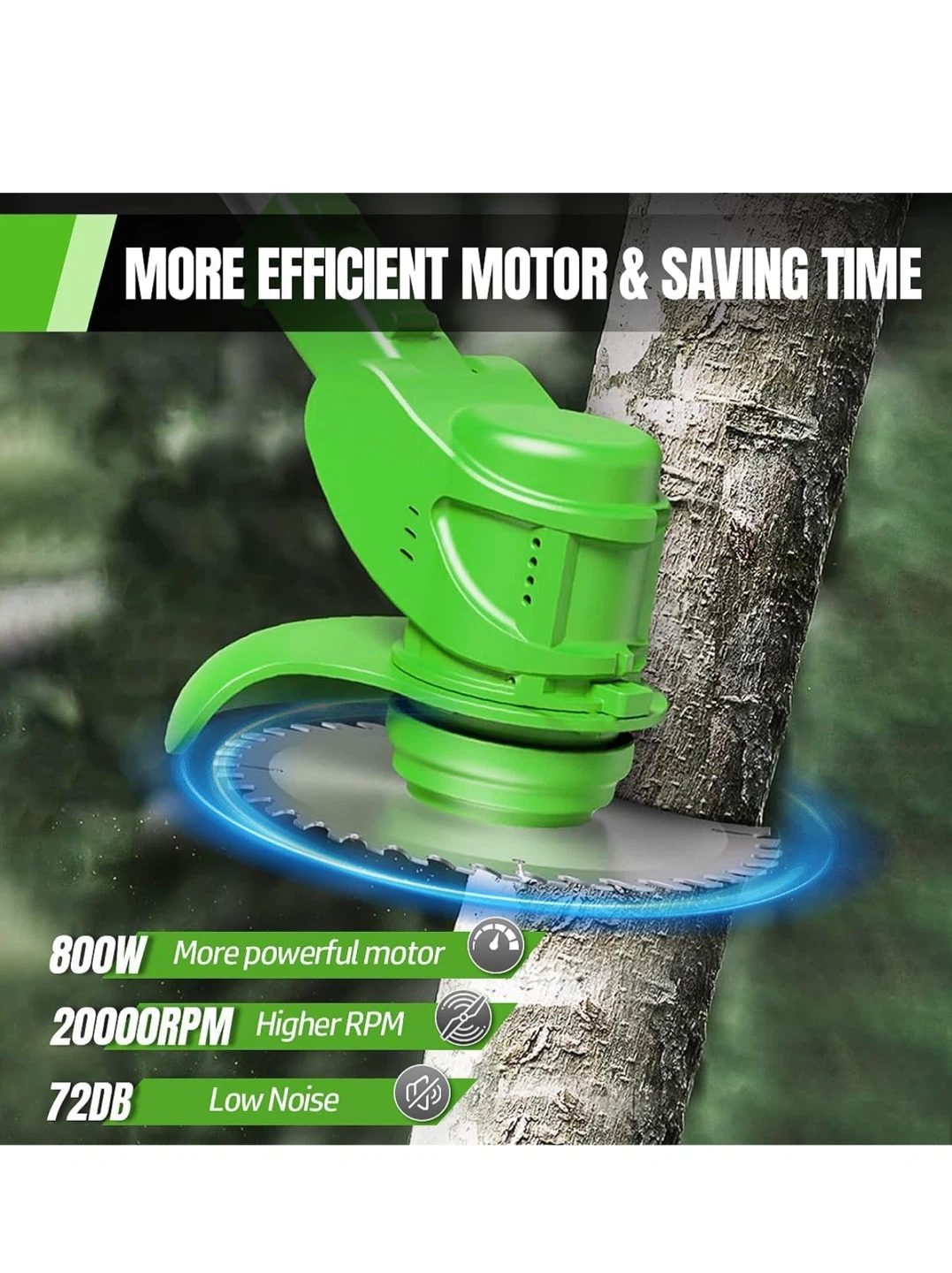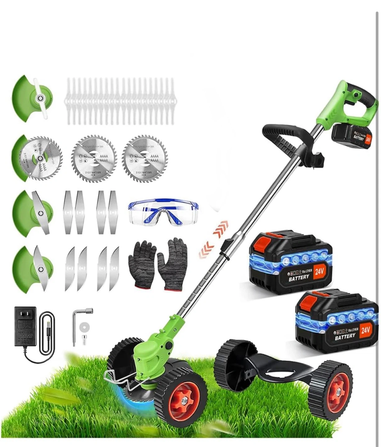 This is a 4-in-1 multifunction grass trimmer/hedge/edger. It features a more efficient motor and saves time. The height is adjustable from 33 to 47 inches. It also has a 90° adjustable cutting path and a dual safety switch. The motor is more powerful with a 35% performance improvement. It also features a comfortable non-slip handle and comes with 2 x 2000mAh qualified high capacity batteries with 2-3 hours charging time and 55-60 minutes working time/2x2000mAh