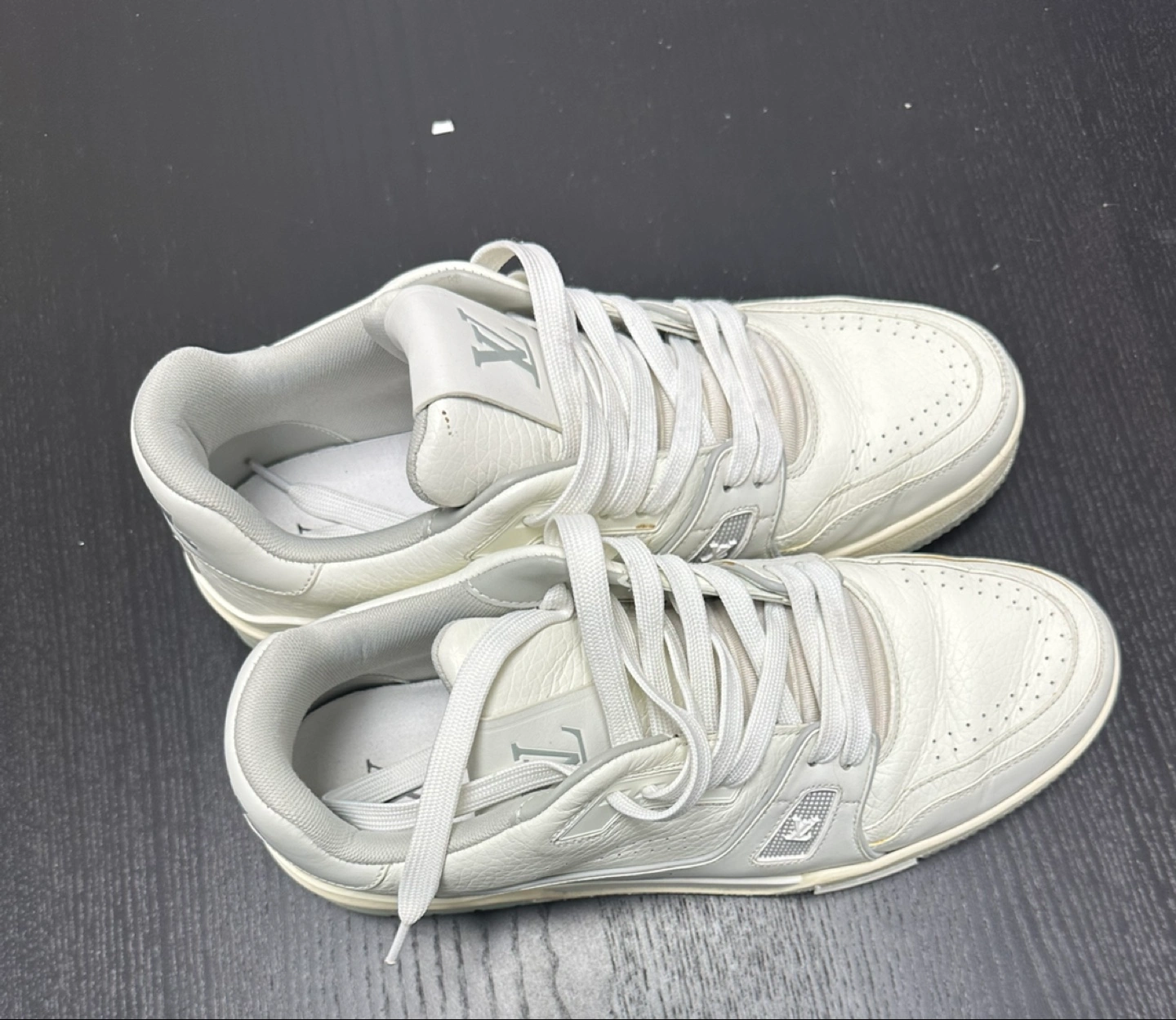 Selling a pair of Louis Vuitton sneakers in a clean white leather. Good condition