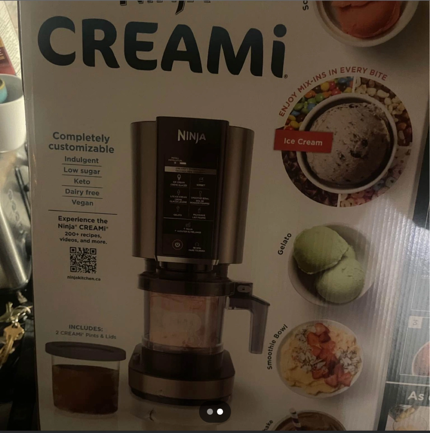 Make your own ice cream, gelato, smoothie bowls, and more with the Ninja CREAMI! It's completely customizable, so you can make indulgent, low sugar, keto, dairy-free, and vegan treats. Includes 2 CREAMI pints and lids. Enjoy mix-ins in every bite!