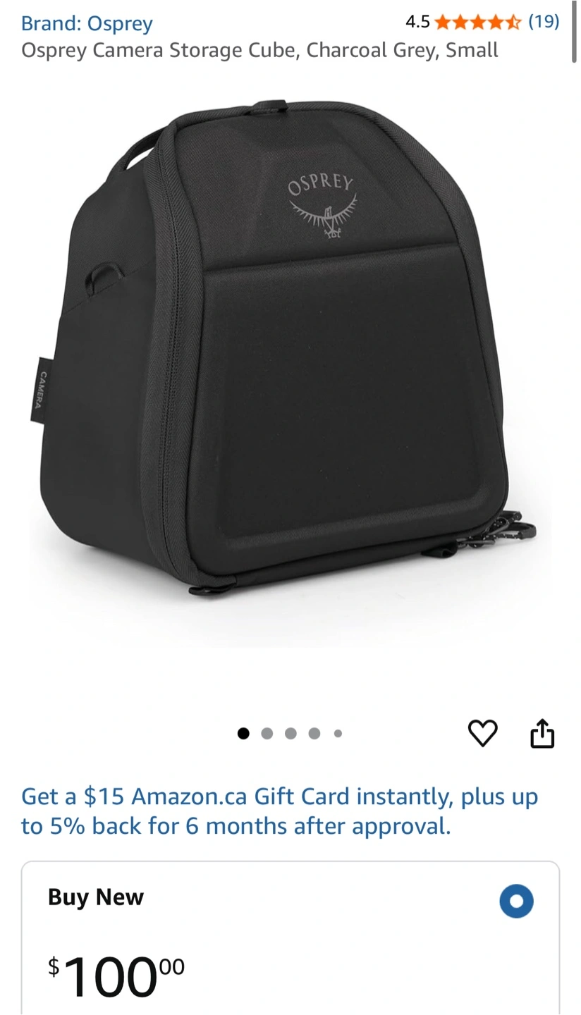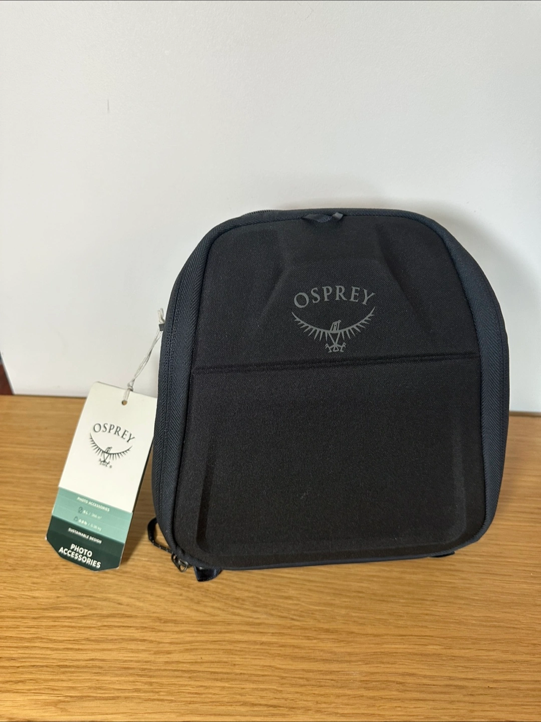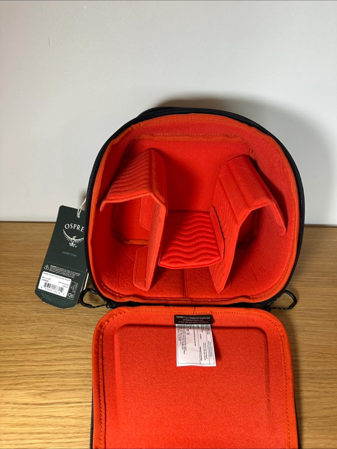 This is an Osprey Camera Storage Cube in charcoal grey, size small. It's perfect for keeping your camera and photo accessories safe and organized. The interior is a vibrant orange, with adjustable dividers to customize the space to your needs. The cube is new with tags and comes with the original tag attached!