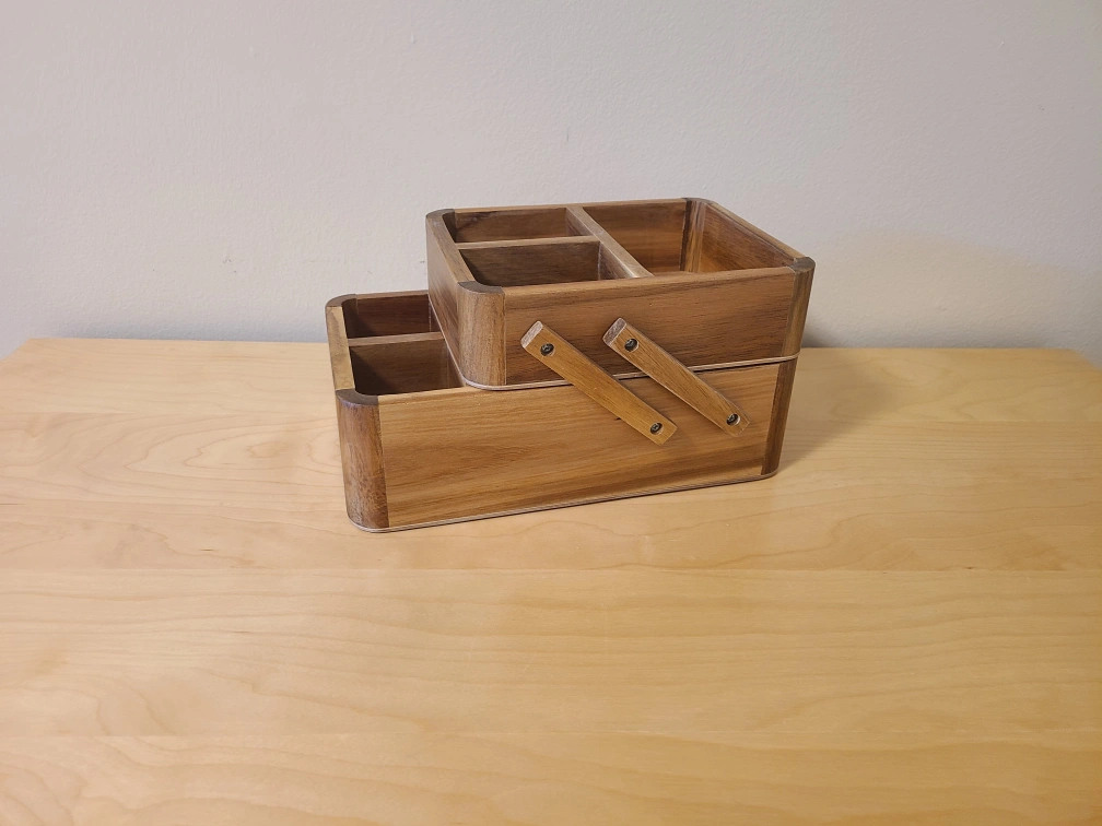 Selling a wooden sewing box organizer. It's in great shape and perfect for storing your sewing supplies or other small items. The box features multiple compartments to keep things organized and easily accessible.