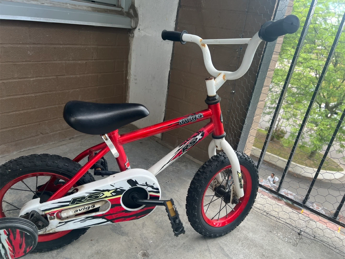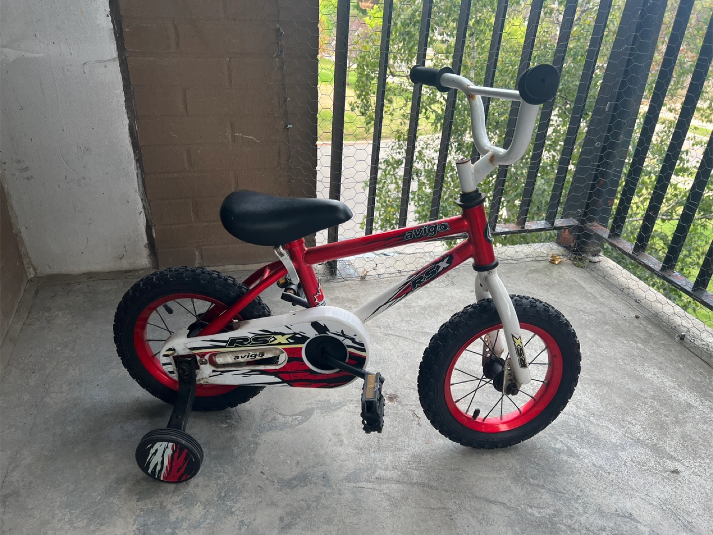 Selling an Avigo RSX kids bike, perfect for learning to ride! It's a 12-inch bike with training wheels, ideal for young children. The bike is red and white, and it's in good condition for its age. Great for getting your little one started with cycling!