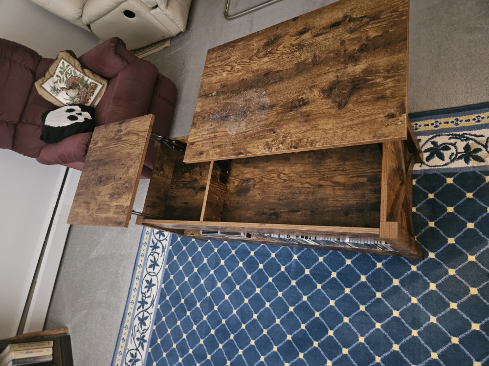 Selling a lift top coffee table with hidden storage. It's in great condition and perfect for small spaces! The lift top makes it easy to work or eat from the couch, and the hidden storage is great for storing books, magazines, or other items