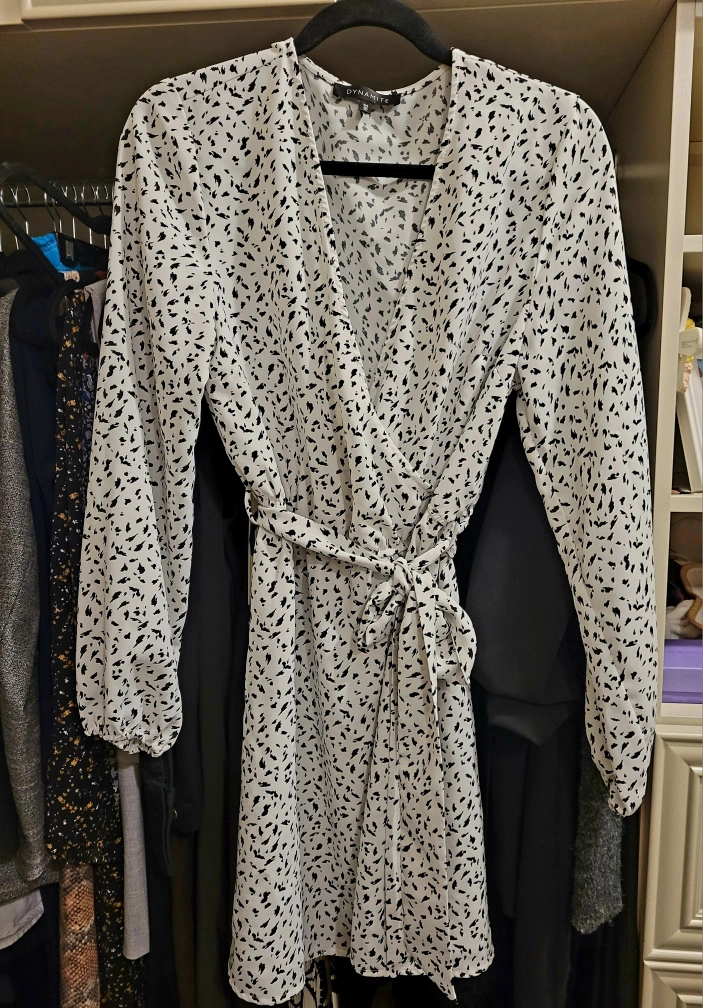 Selling a cute Dynamite dress! It features a stylish white and black pattern. I have it pinned on the neck line in second photo because dress is to big on me now. The dress is a size Large and in great condition. Perfect for any occasion!