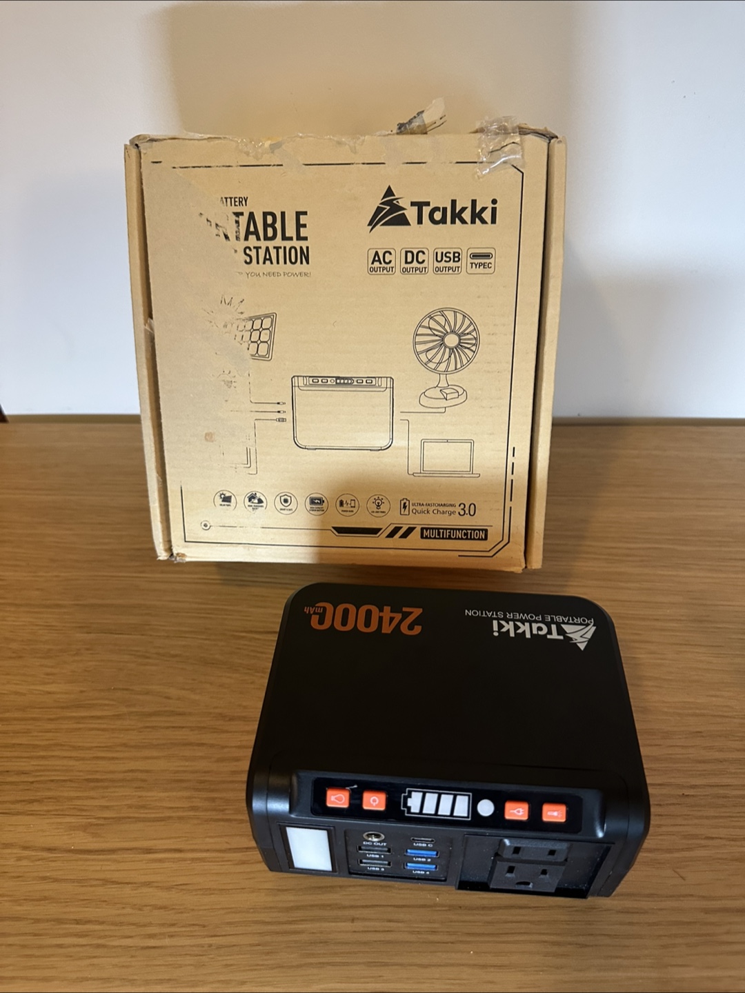 Selling a Takki Portable Power Station 88Wh. This small generator is perfect for camping, home use, or laptop emergencies. It features a 120W peak AC outlet for battery backup and has multiple output options including AC, DC, and USB. The box is included!