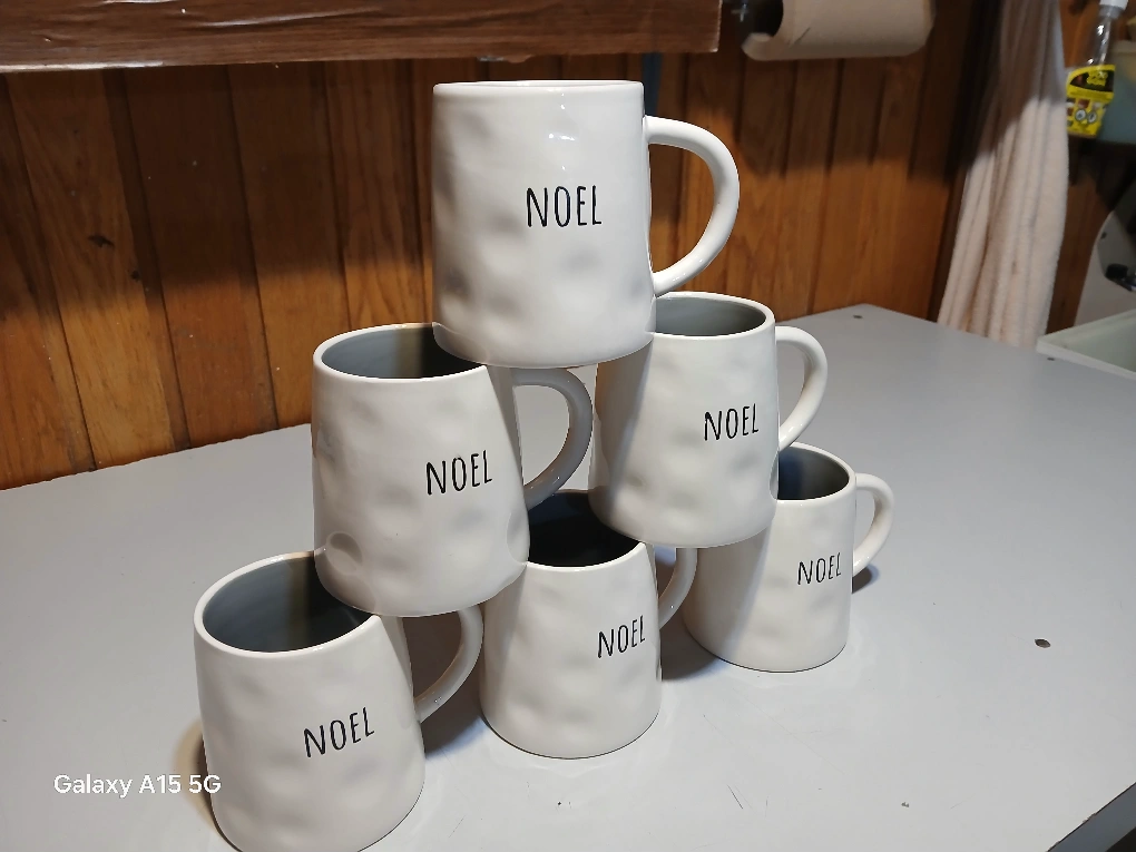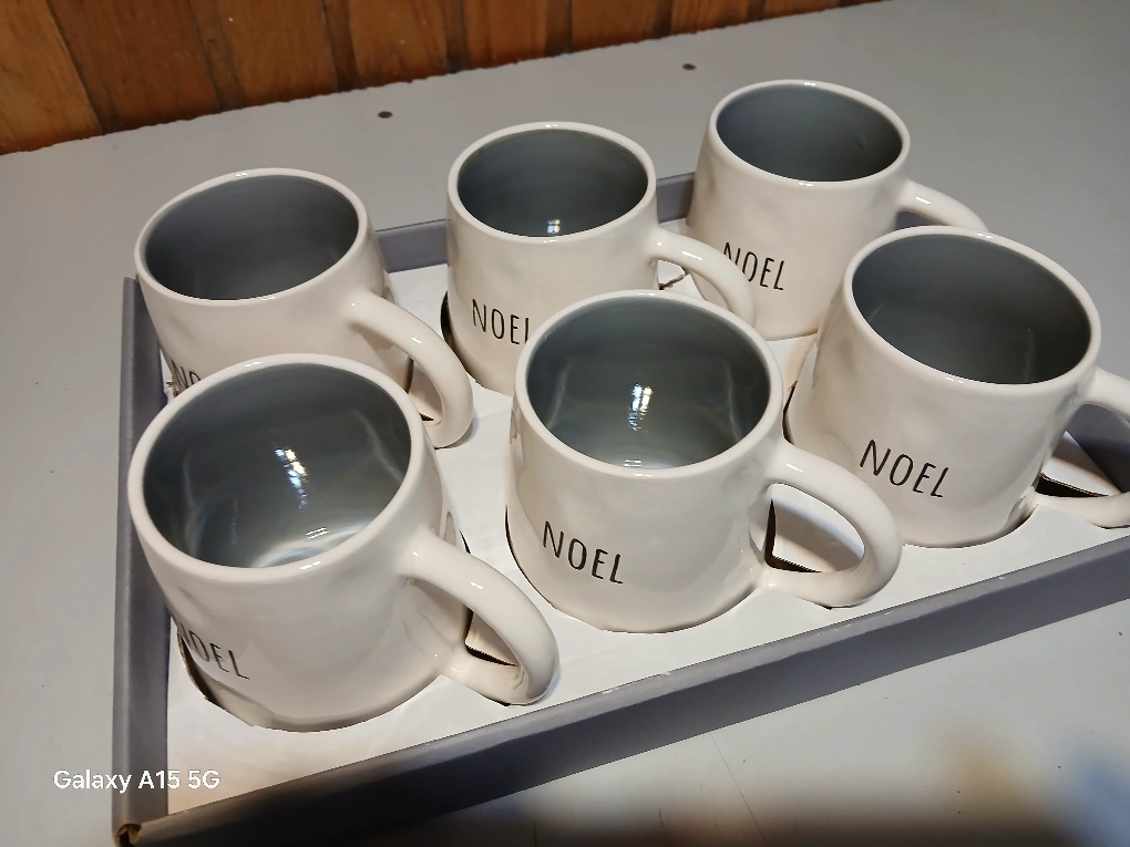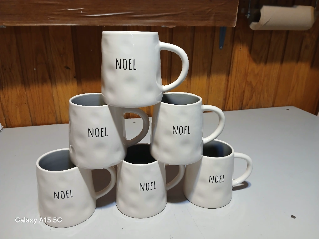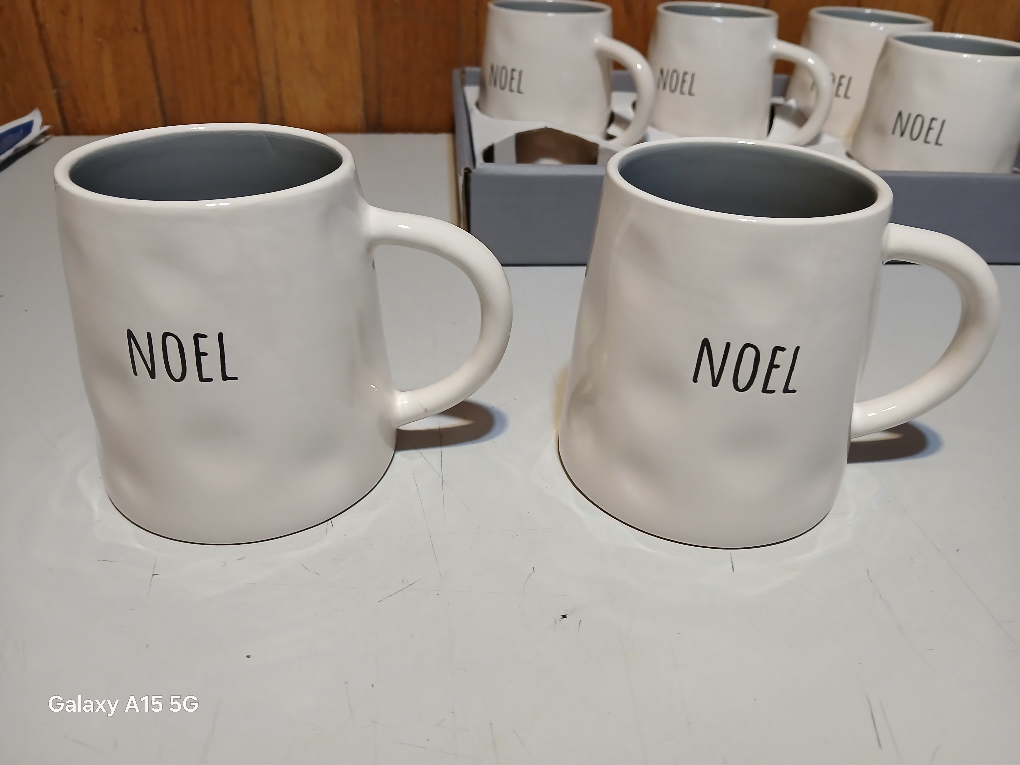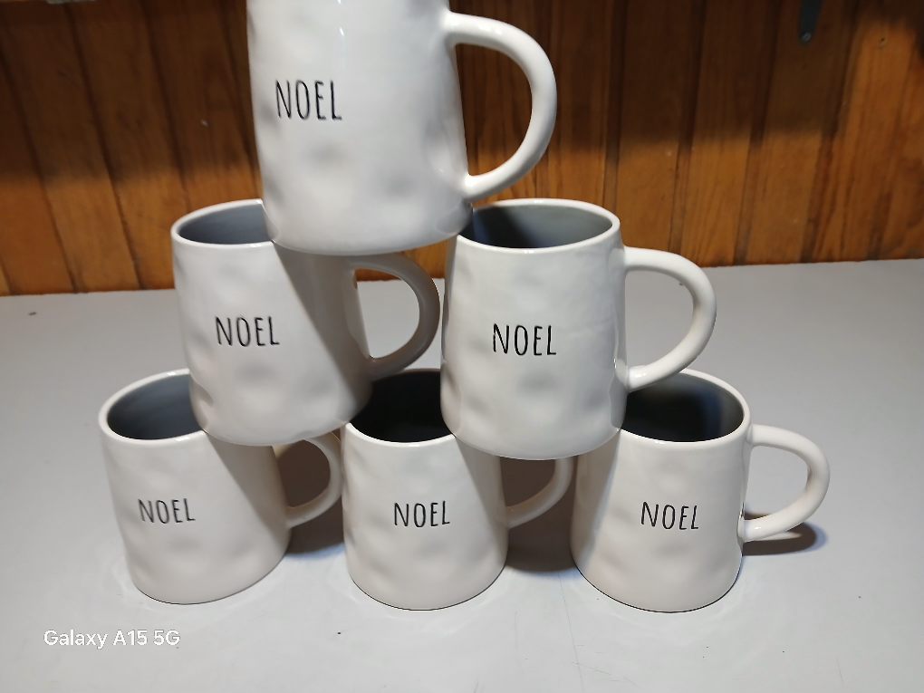 Selling a set of six Rae Dunn mugs, each with "NOEL" written on them! They're in great shape and ready to bring some holiday cheer to your kitchen. The mugs have a grey interior.