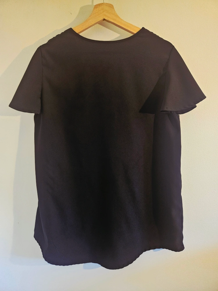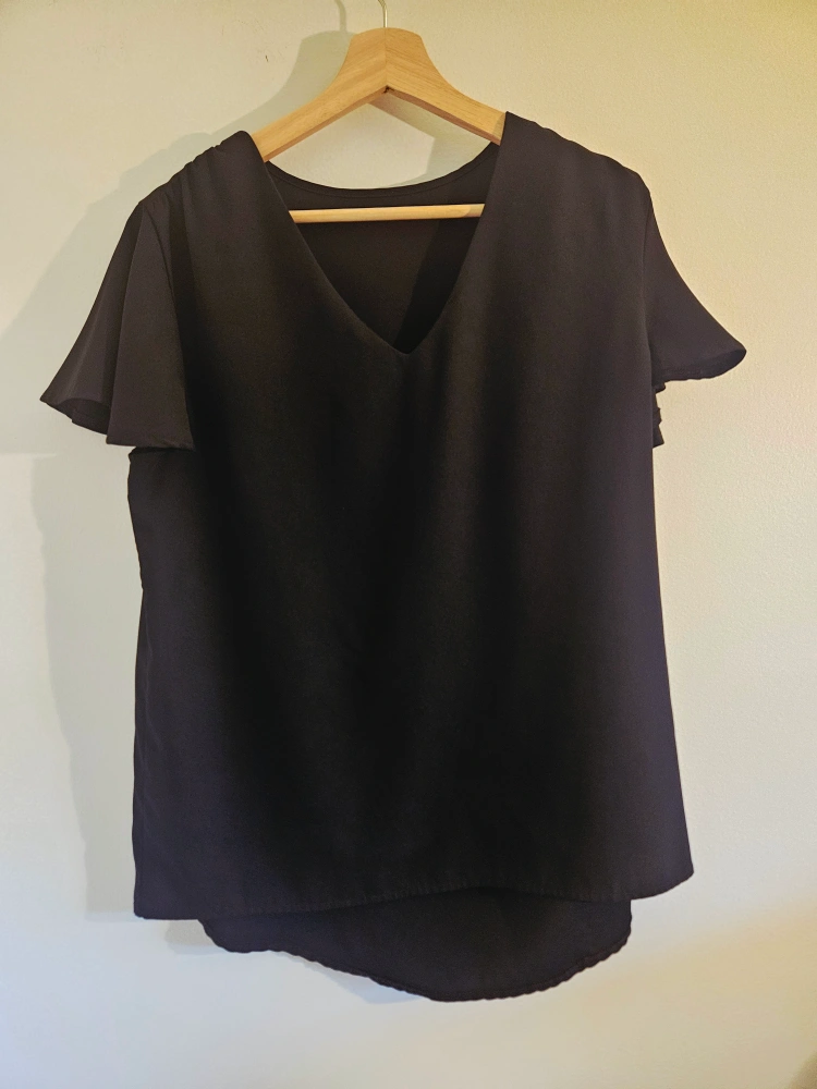 Selling a lovely black blouse with flutter sleeves. Size L. The material is soft and comfortable, perfect for dressing up or down. It features a flattering V-neck design. A versatile addition to your wardrobe!