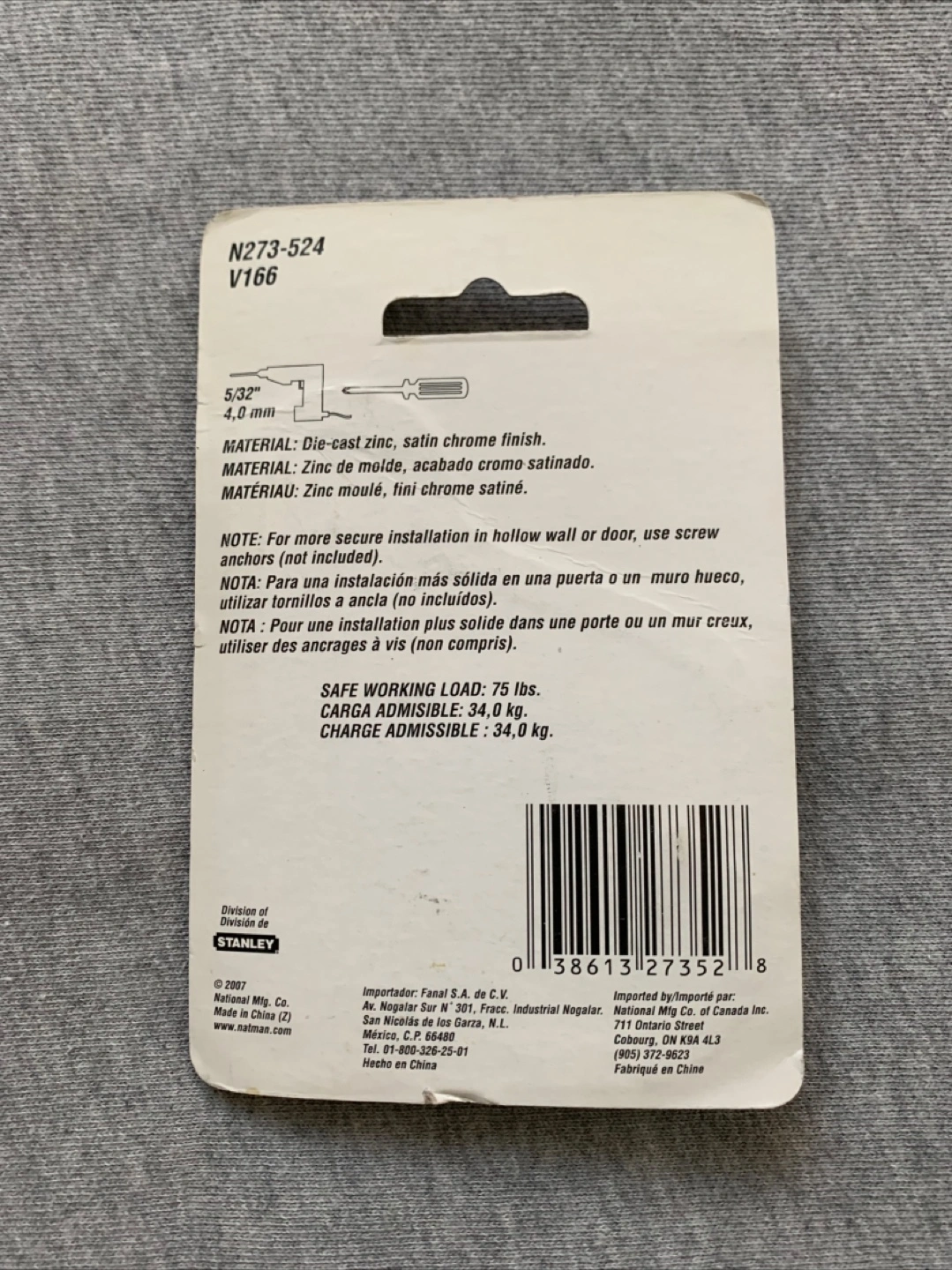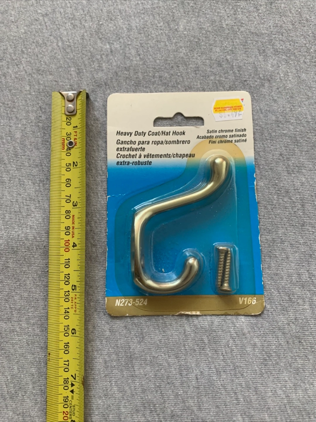 Made from die-cast zinc and has a safe working load of 75 lbs (34 kg). It measures 5/32" (4.0 mm). I don’t know if you’d call it gold or brass coloured? Purchased many years ago (apparently at Home Hardware in St. Jacob’s) to replace a missing hook on a hat rack but never got around to completing that project. N273-524 V166