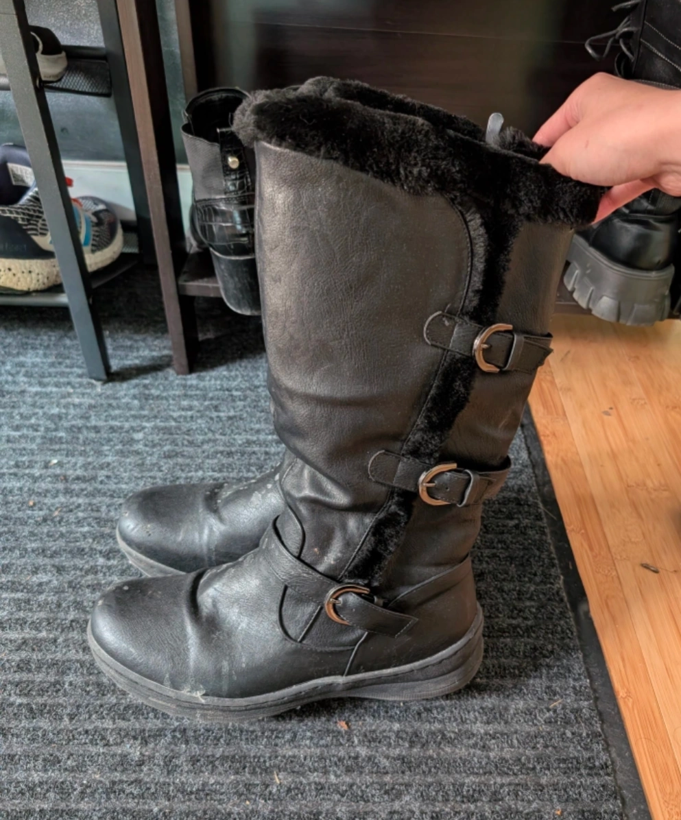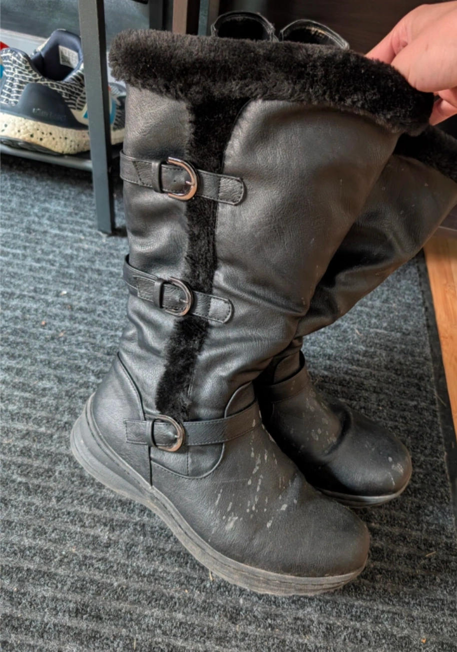 A pair of black winter boots in size 8. They have some signs of wear but are still in good condition for keeping your feet warm and dry during the winter months. The boots feature a faux fur trim and buckle details. Address: Unionville; porch pick-up only.