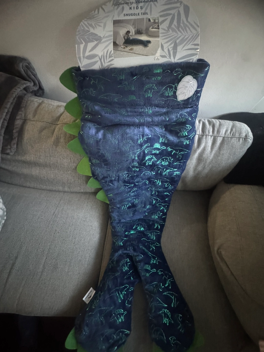 80Tommy Bahama Kids Snuggle Tail in a fun dinosaur design! It's a cozy and playful blanket for kids to snuggle up in