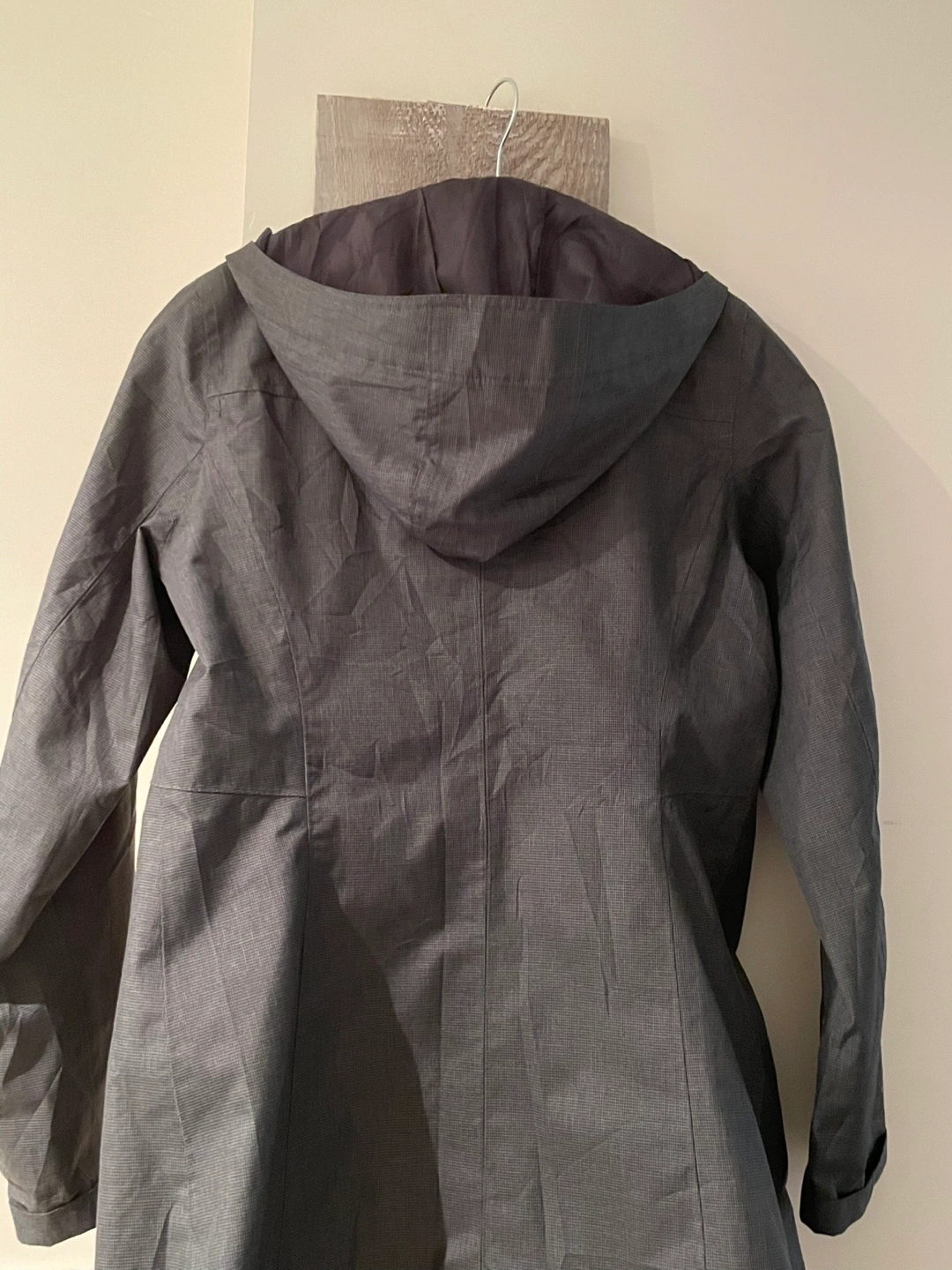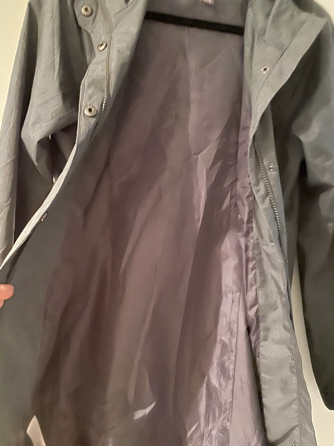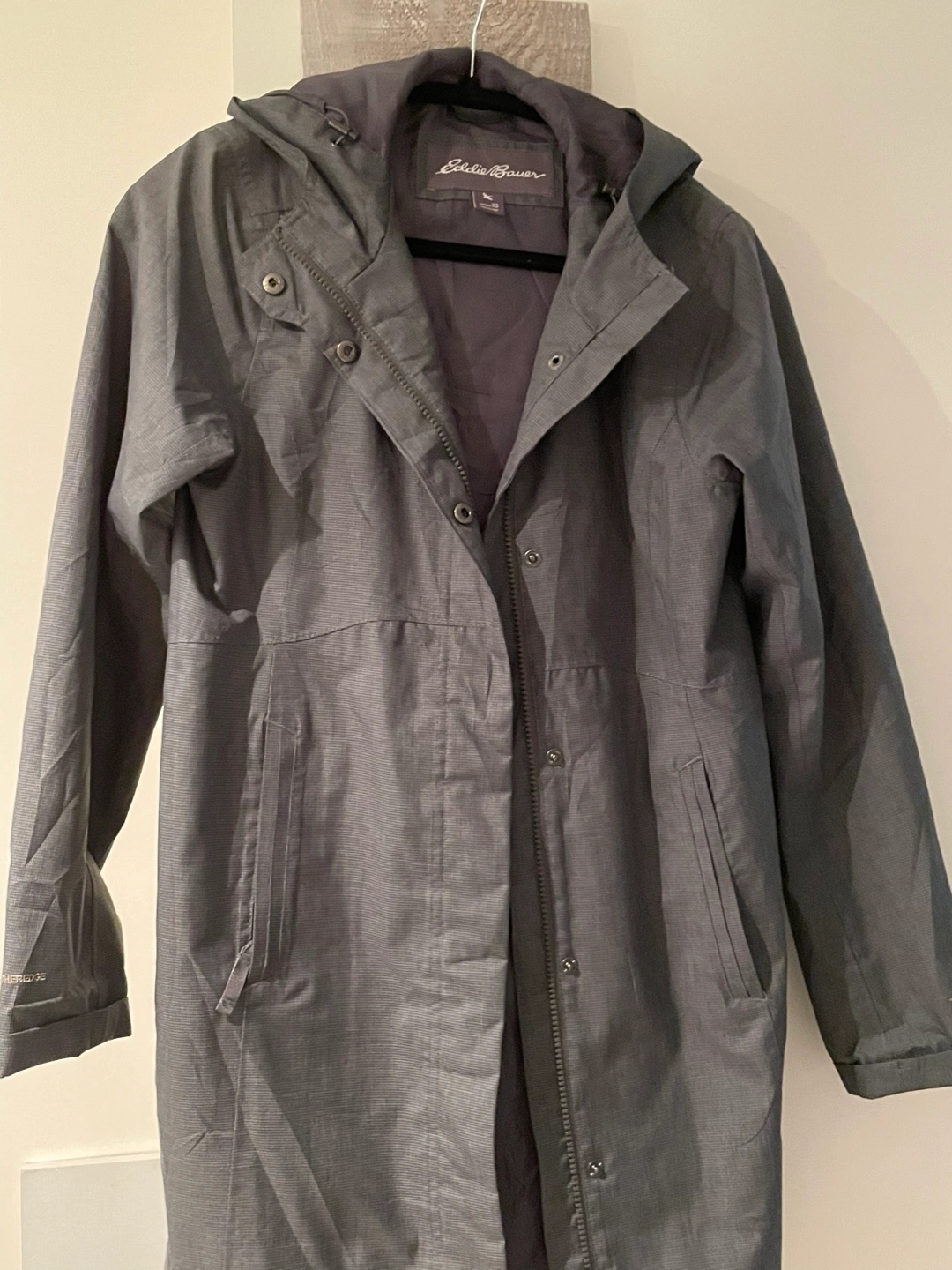 Selling a gently used Eddie Bauer rain coat in women's size XS. It's a stylish grey colour and perfect for those rainy days! Has a hood and lots of pockets