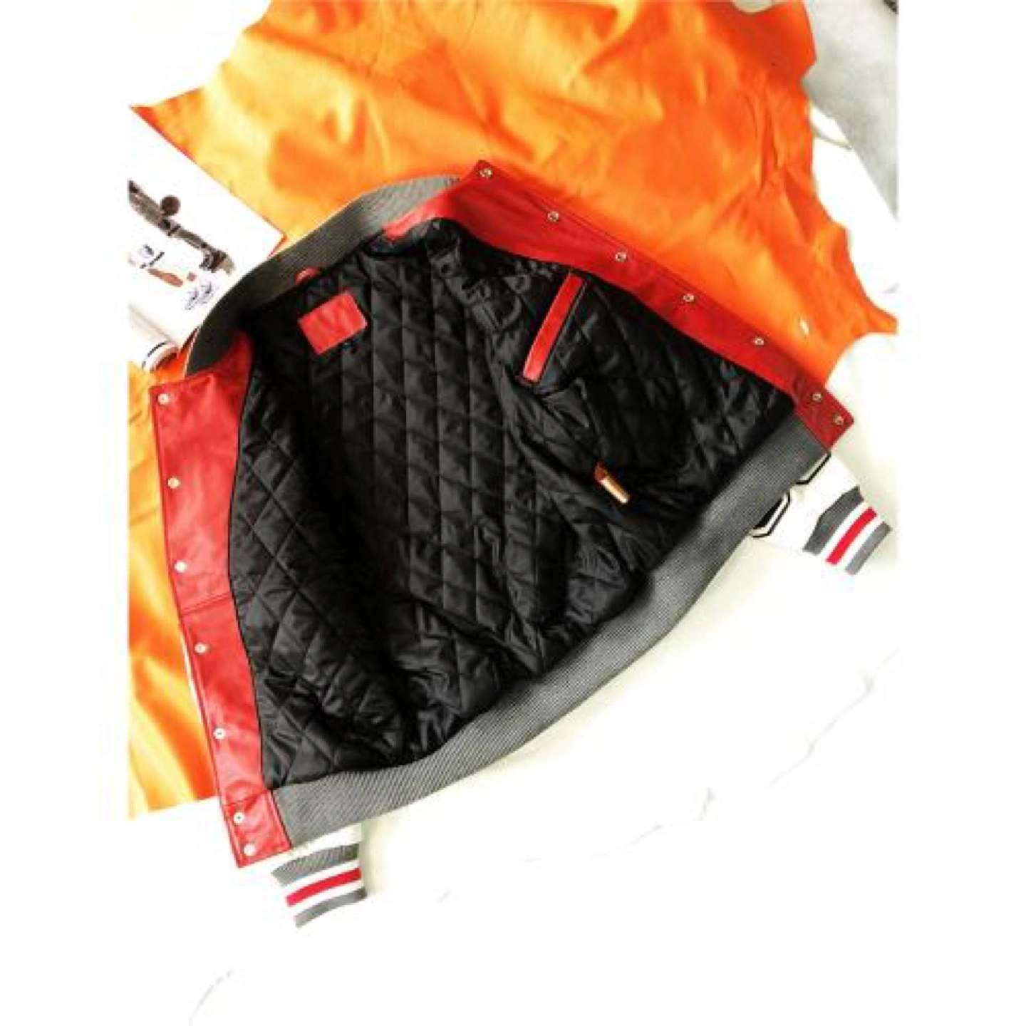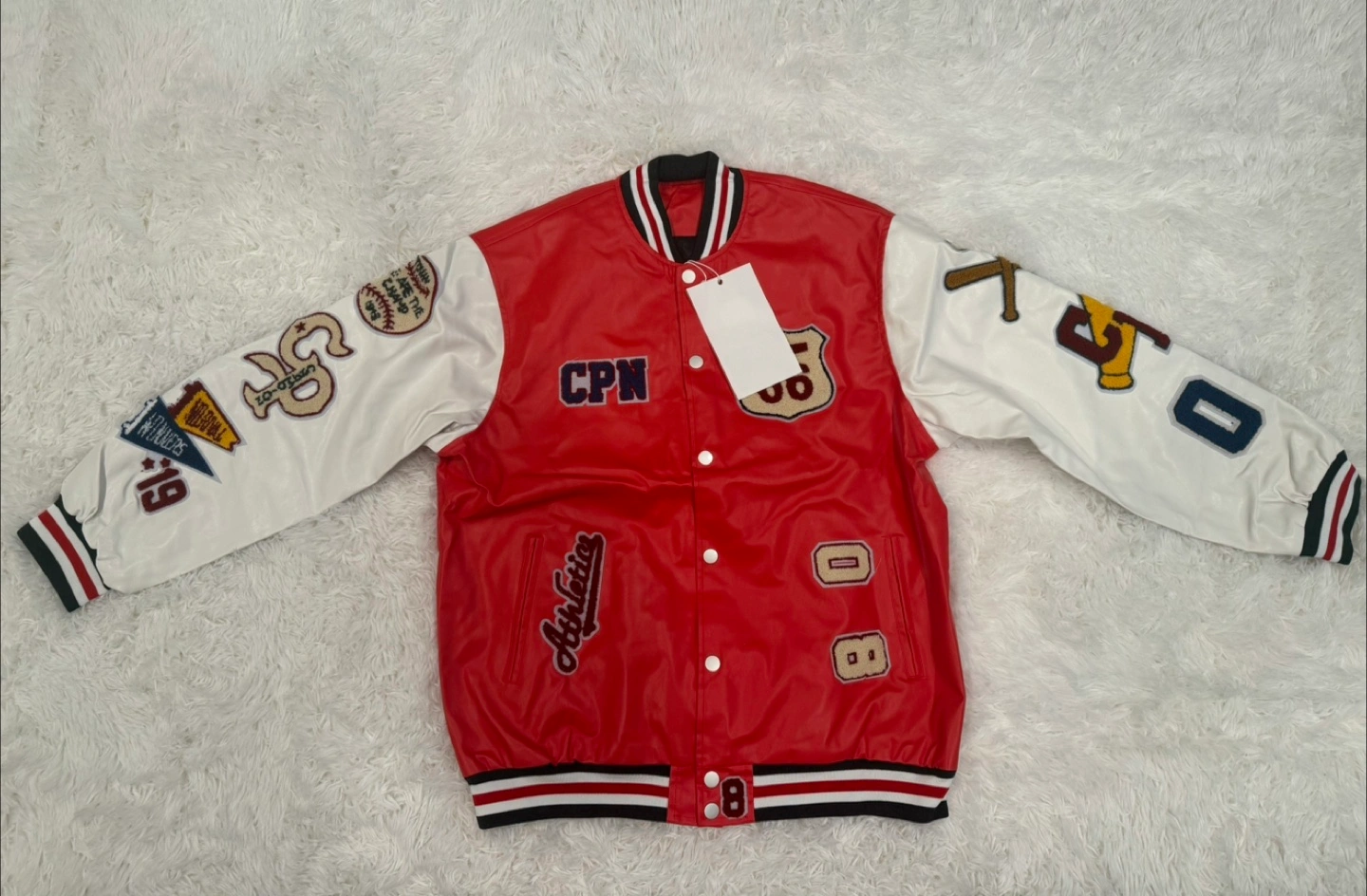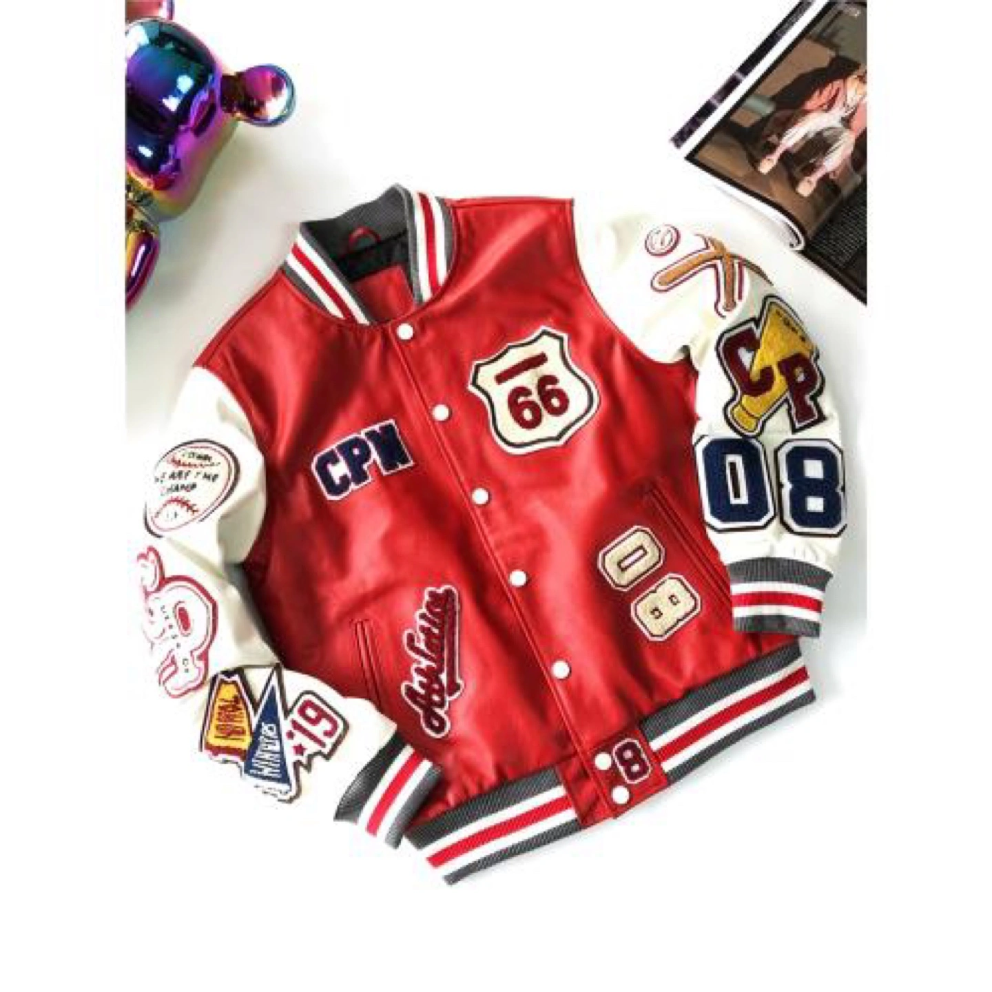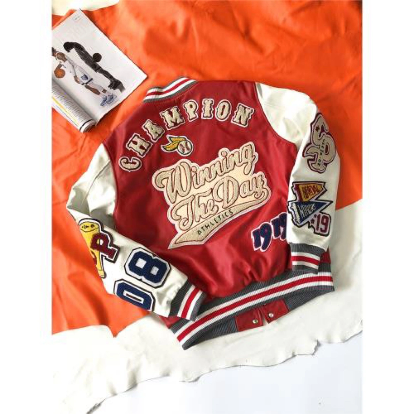 Check out this Champion varsity jacket with a cool retro vibe! The jacket features a red body and white sleeves, adorned with various patches and lettering. It's a real statement piece!