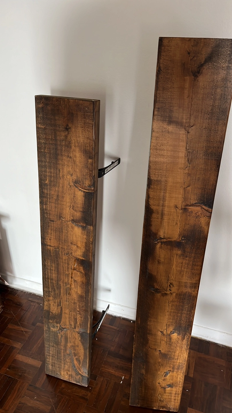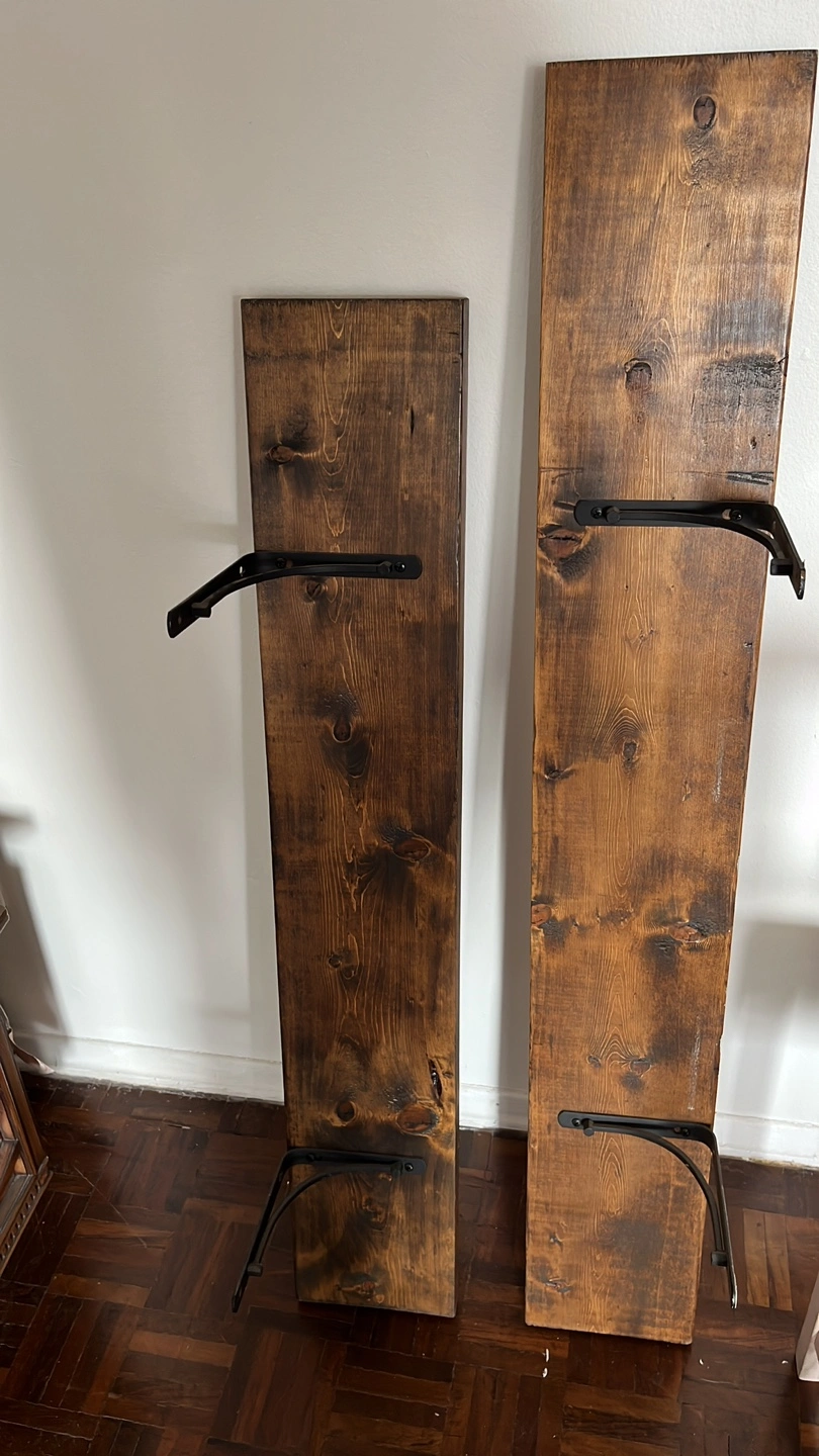 Two wooden (4ft and 3ft) shelves with brackets are available. They are brown with a wood grain texture. Great for adding storage to any room