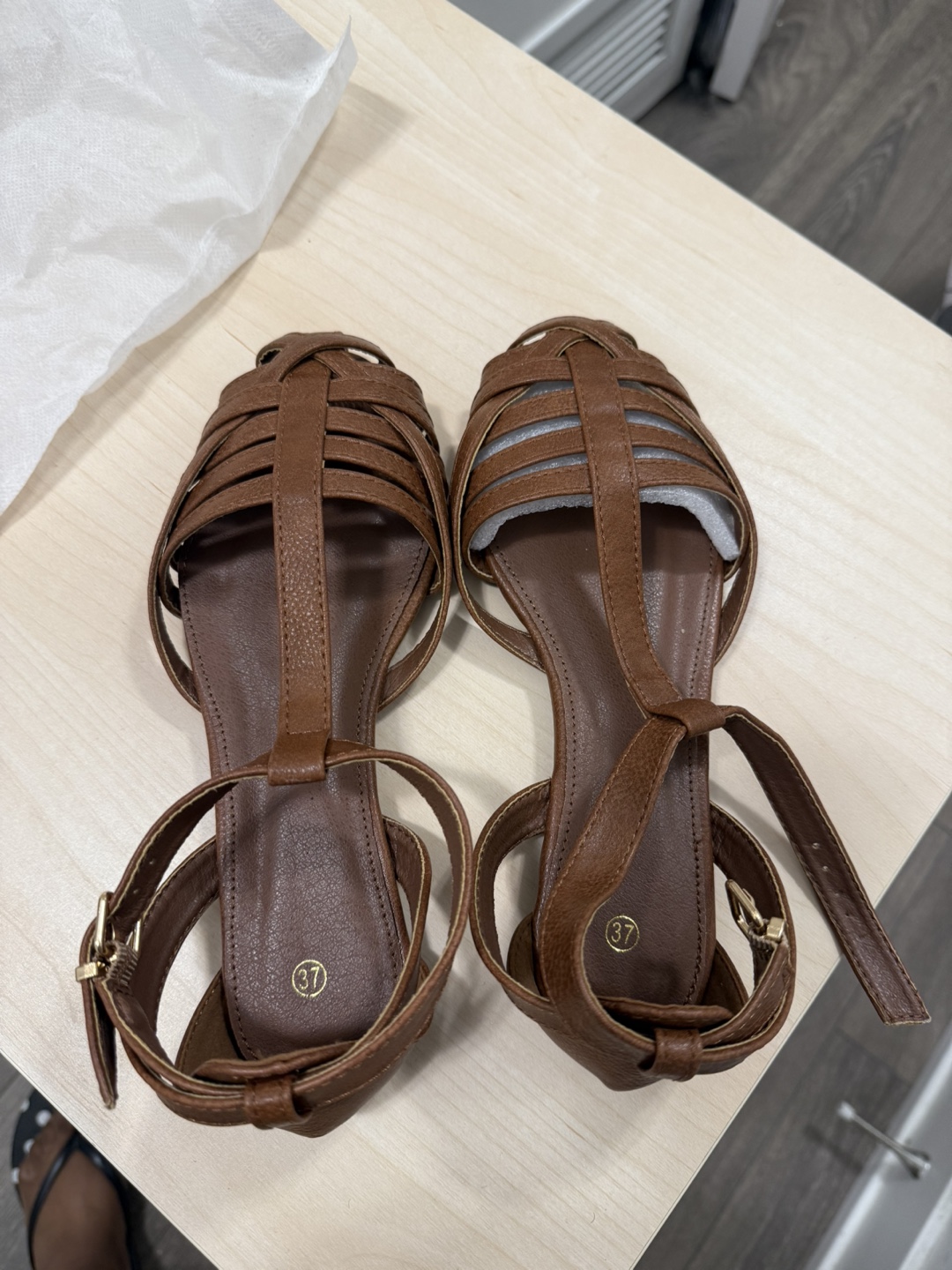 Cute brown gladiator-style sandals in EU size 37, which is about a size 7 in Canada/US. They're in great shape and ready for summer!