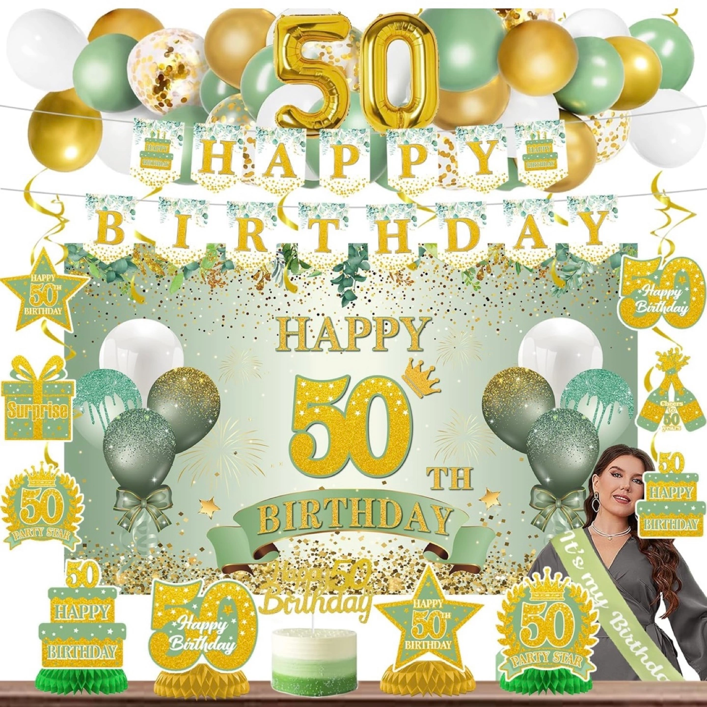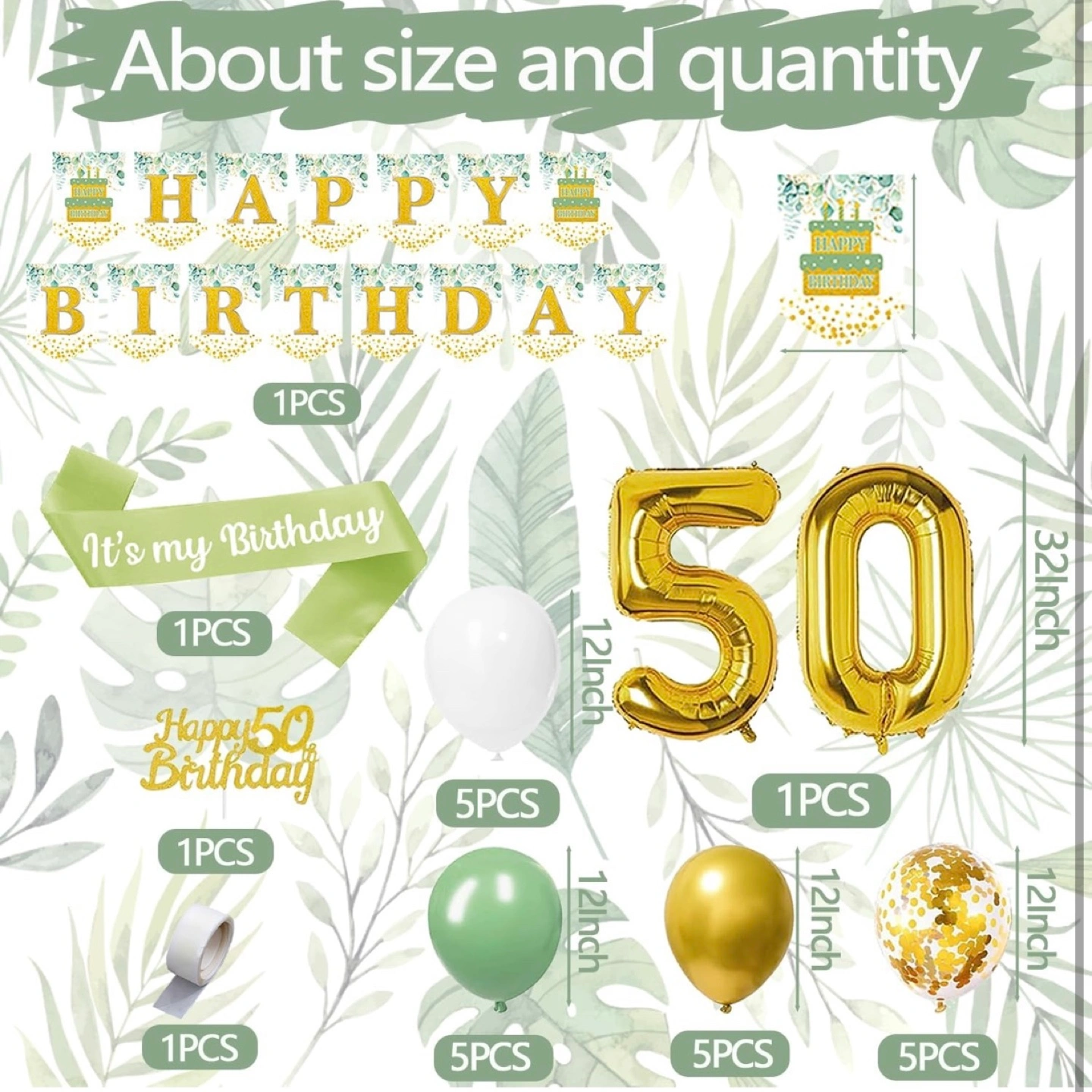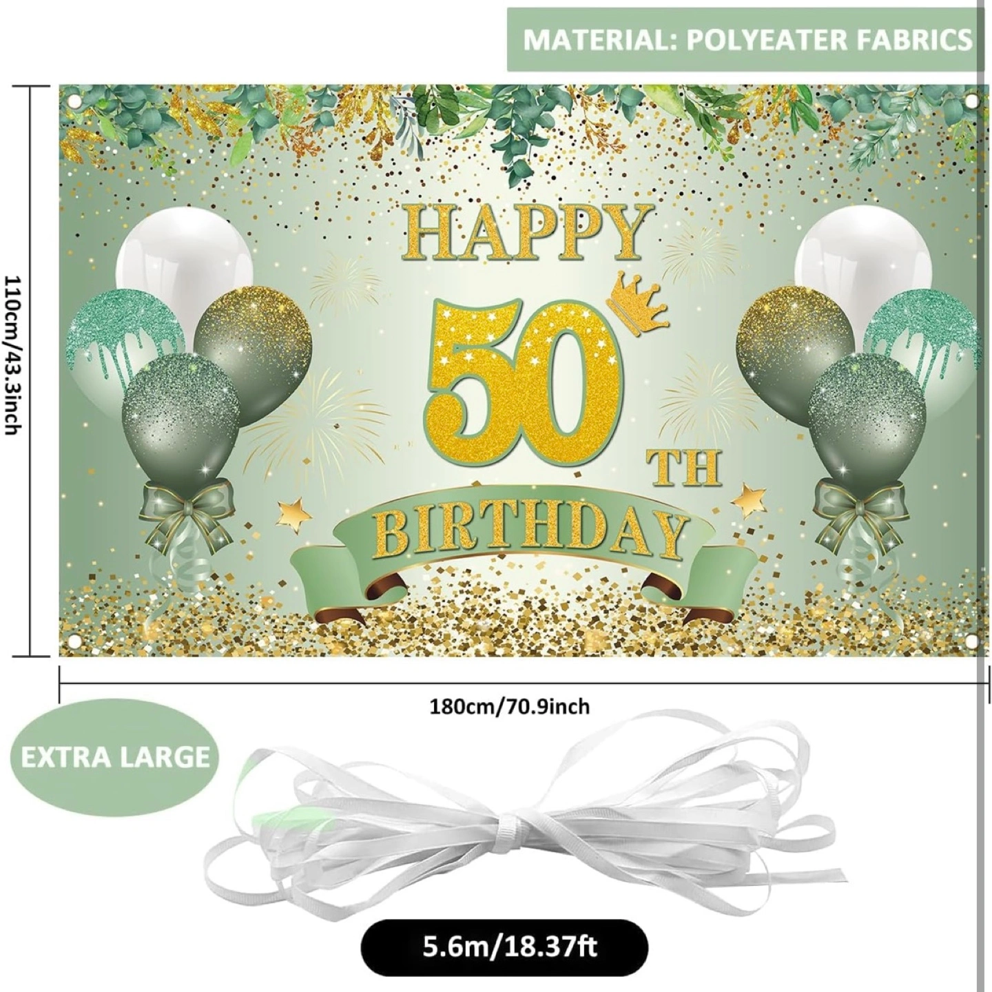 28Get ready to celebrate a milestone with this brand new 50th birthday party decoration set! It includes everything you need to make the occasion extra special. The set features a variety of decorations in gold, white, and green, including: - A 'Happy Birthday' banner - Balloons in various colours - Number '50' balloons - Table decorations - A backdrop measuring 180cm x 110cm (70.9in x 43.3in) The backdrop is made of polyeater fabrics and is extra large, perfect for photos and creating a festive atmosphere