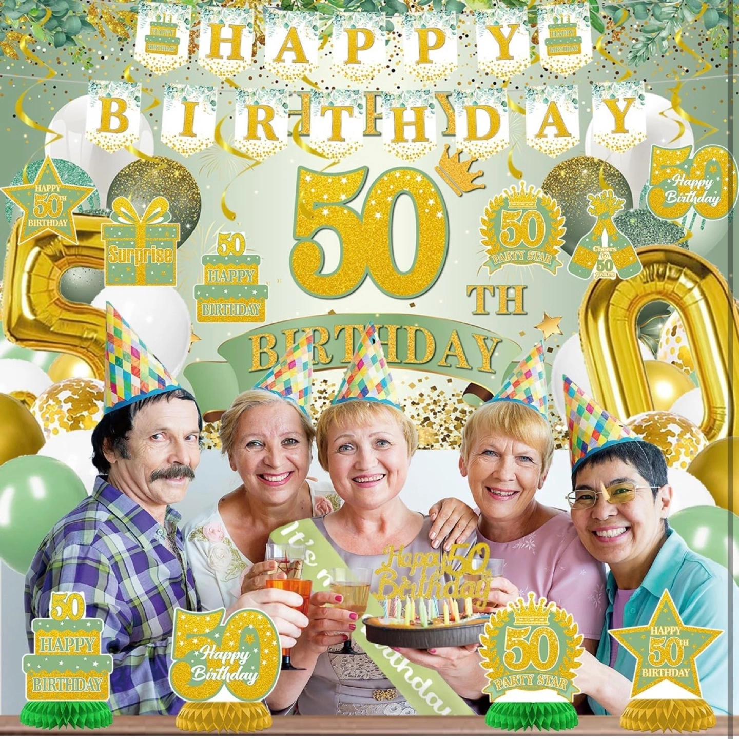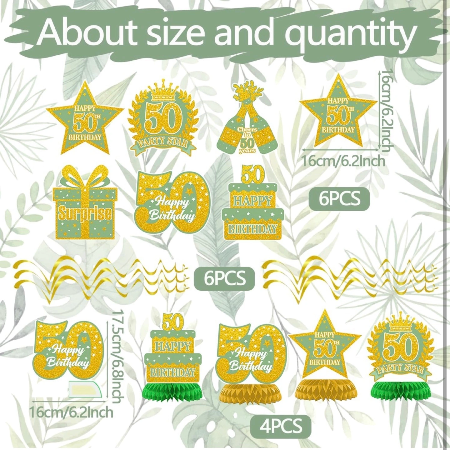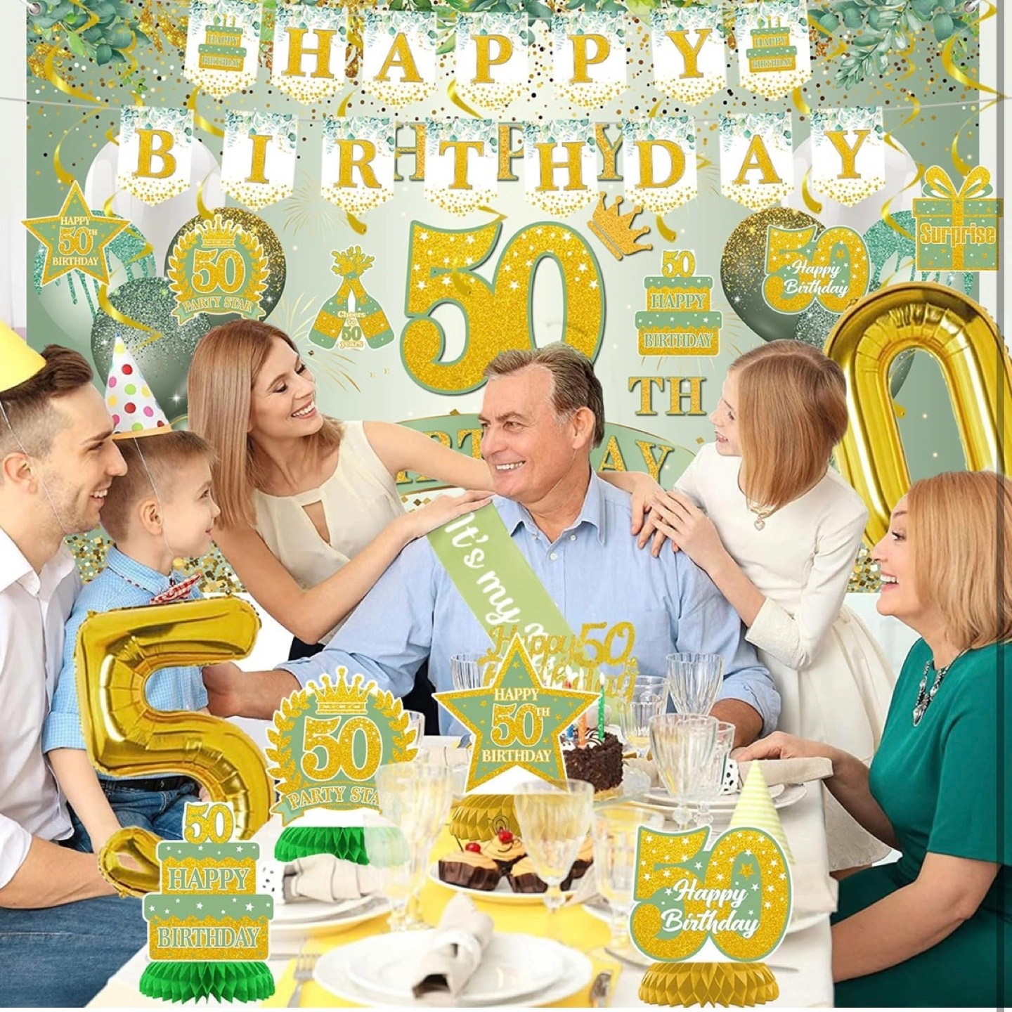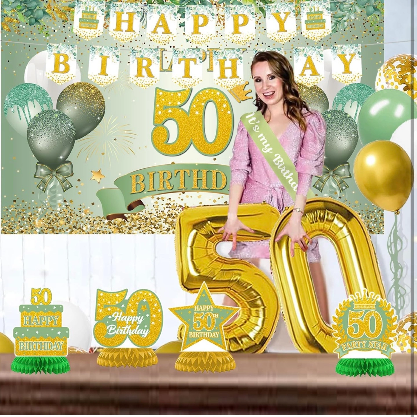 28Get ready to celebrate a milestone with this brand new 50th birthday party decoration set! It includes everything you need to make the occasion extra special. The set features a variety of decorations in gold, white, and green, including: - A 'Happy Birthday' banner - Balloons in various colours - Number '50' balloons - Table decorations - A backdrop measuring 180cm x 110cm (70.9in x 43.3in) The backdrop is made of polyeater fabrics and is extra large, perfect for photos and creating a festive atmosphere