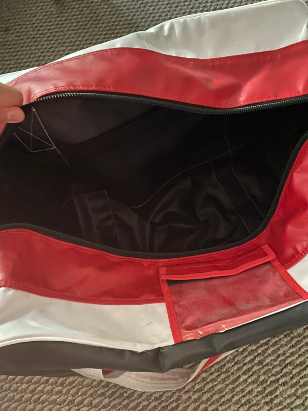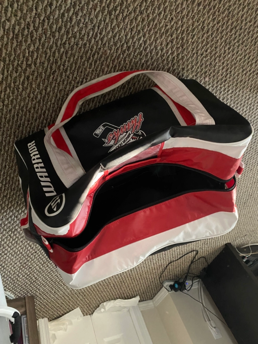 Selling a Warrior hockey bag in new condition. It's red, white, and black. Perfect for carrying your gear to the rink! Amha logo and colours on the bag. It sells for 80$ in Sportszone. Willing to negotiate on the price