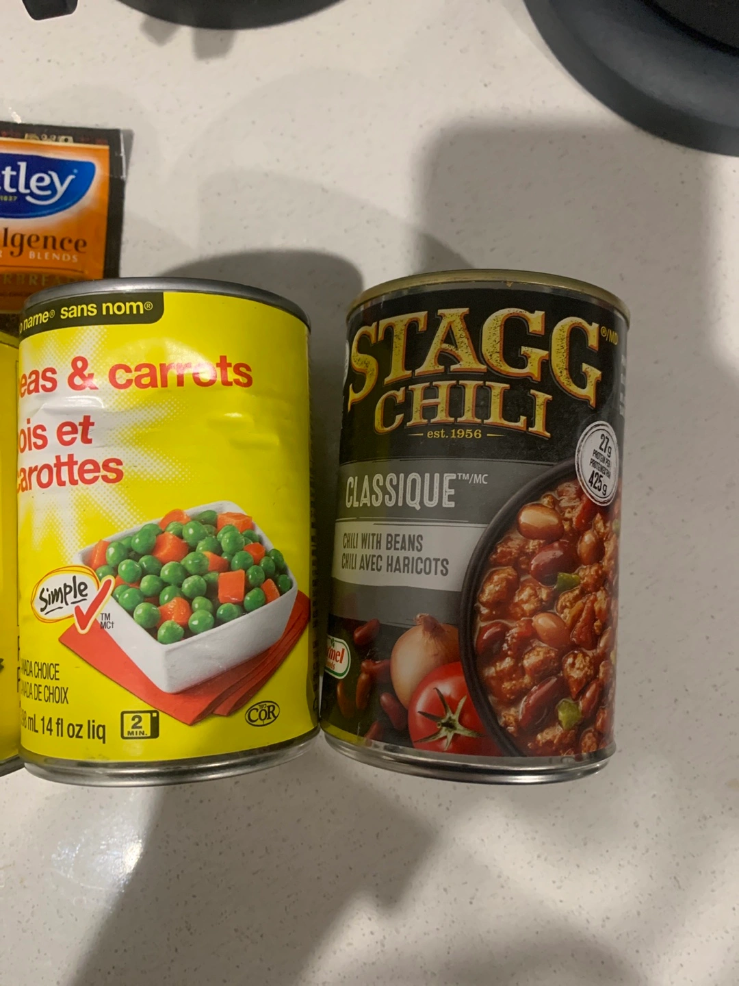 two cans of food: one can of Stagg Chili Classique chili with beans, and one can of Simple peas and carrots. Both are 425g.