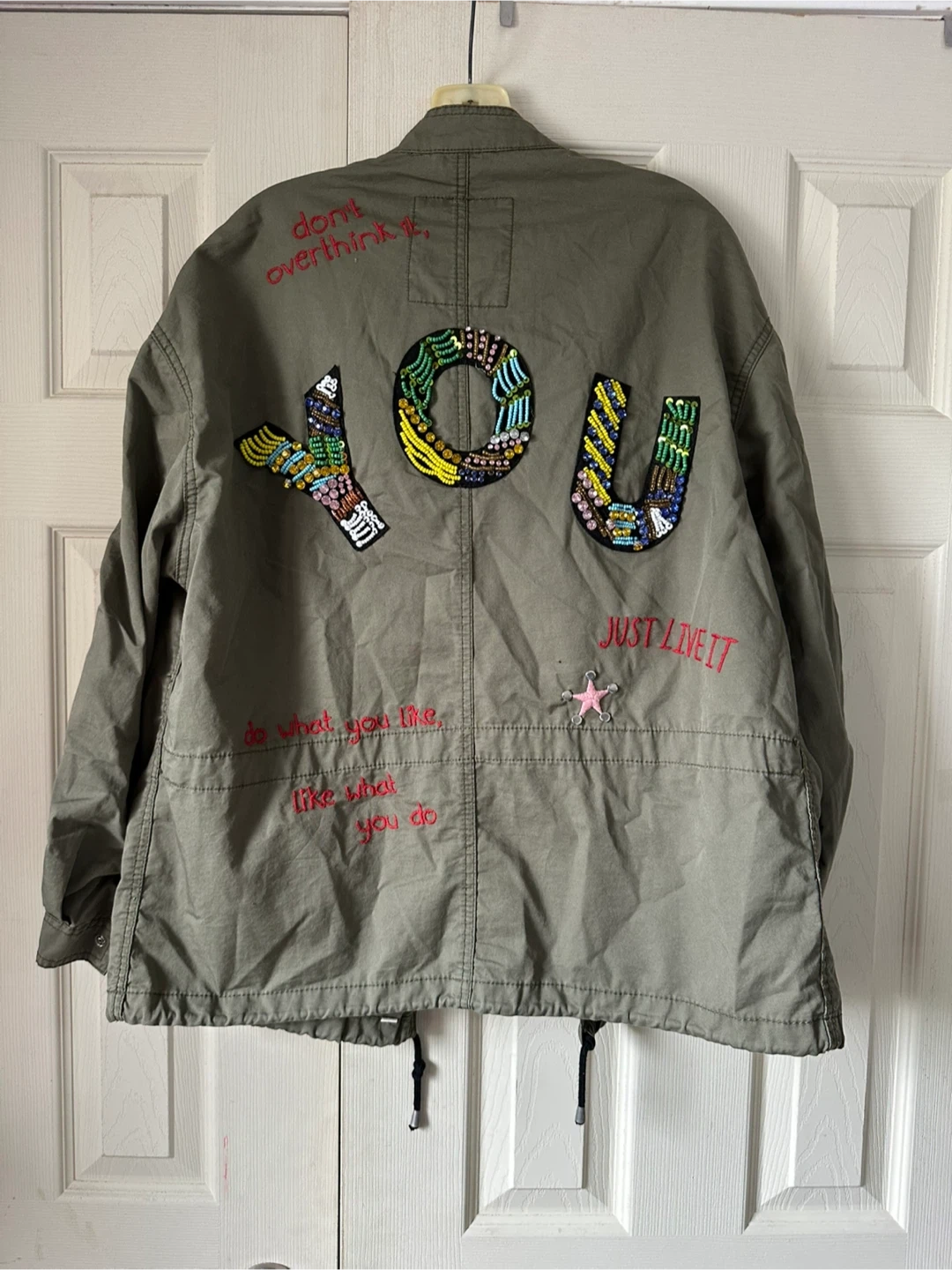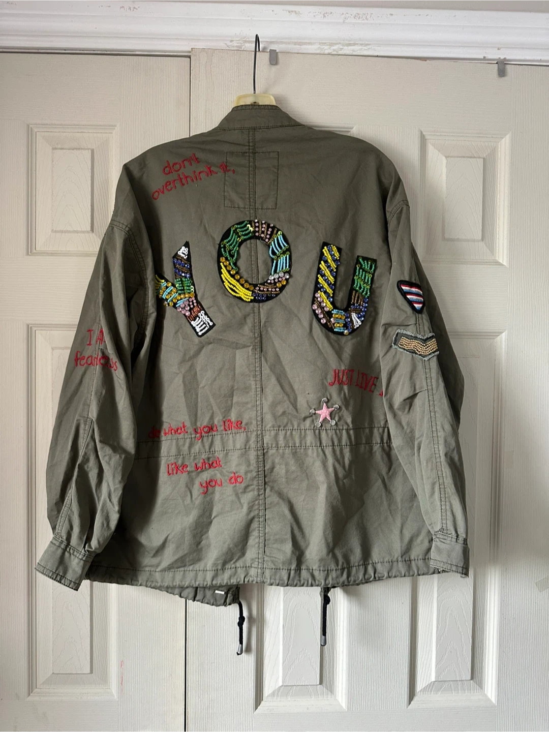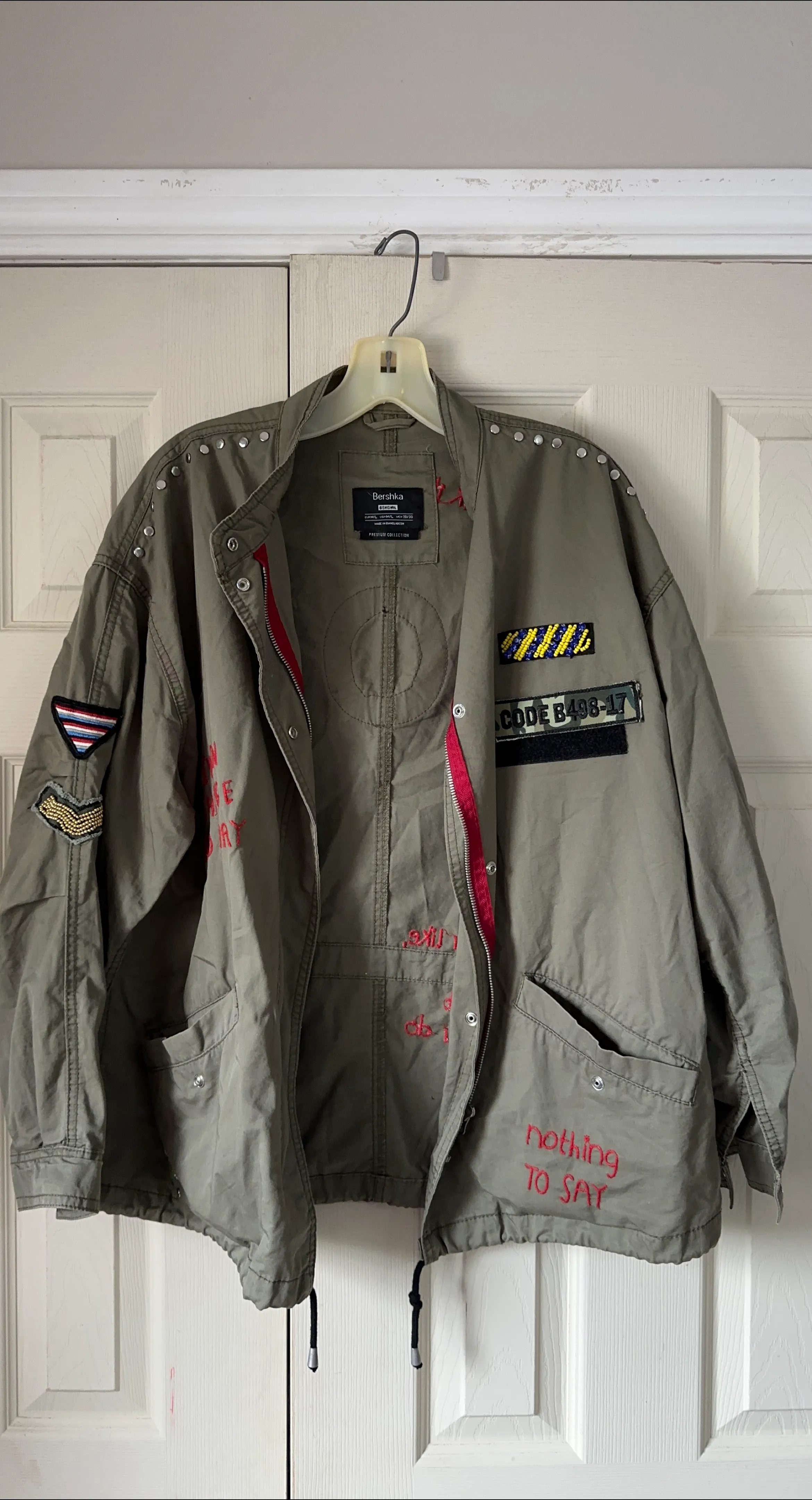 This is a Bershka olive green jacket. It has some unique design elements, including patches and writing. It's a stylish piece to add to your wardrobe!