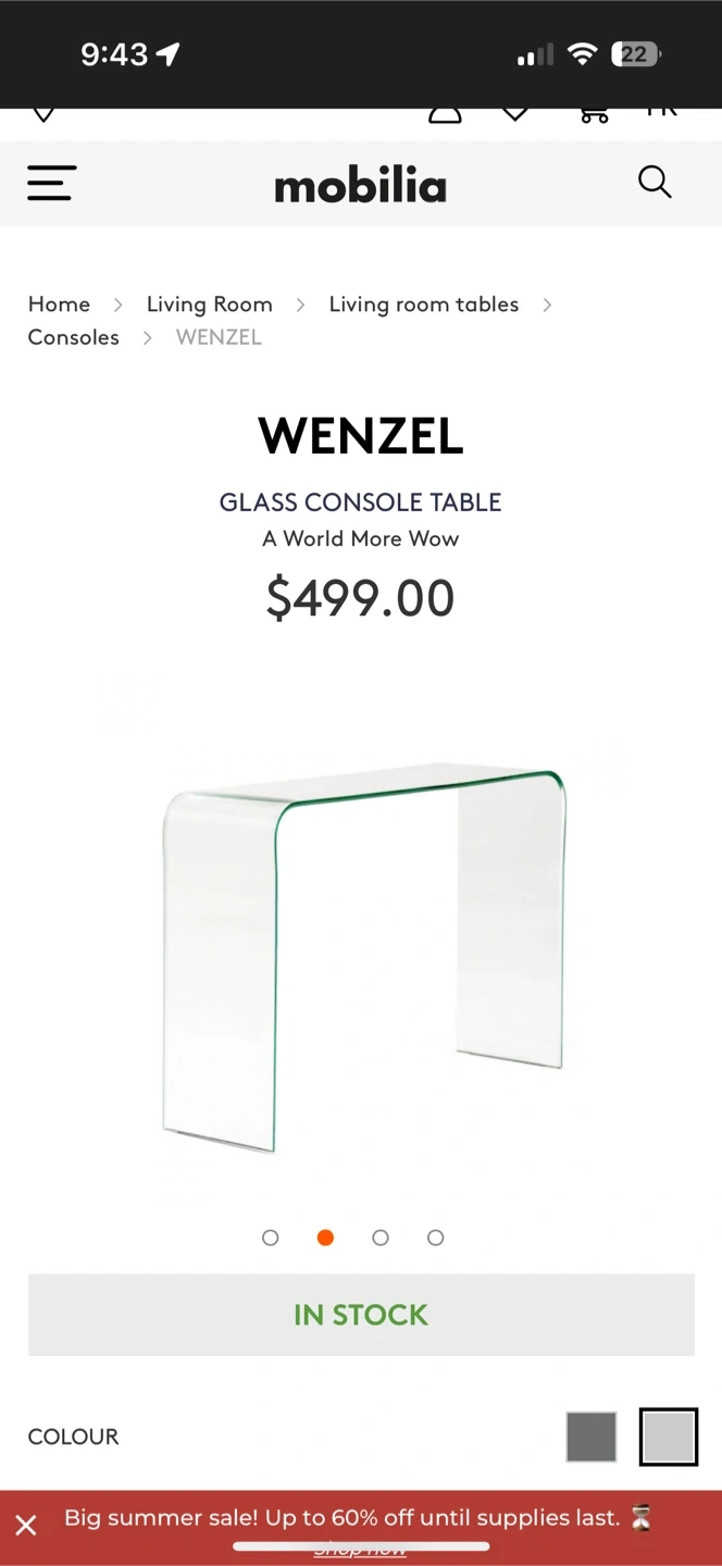Selling a Mobilia Wenzel glass console table. It's in great shape and would look fantastic in any living room. Originally bought for $499. It's a stylish and modern piece!