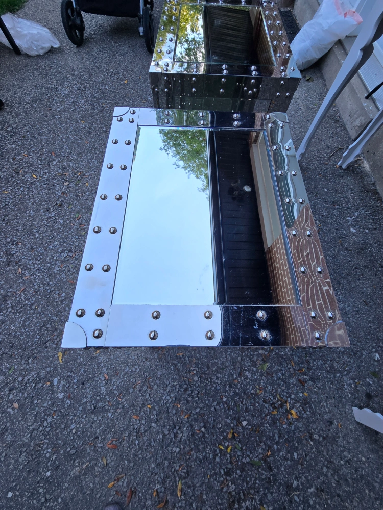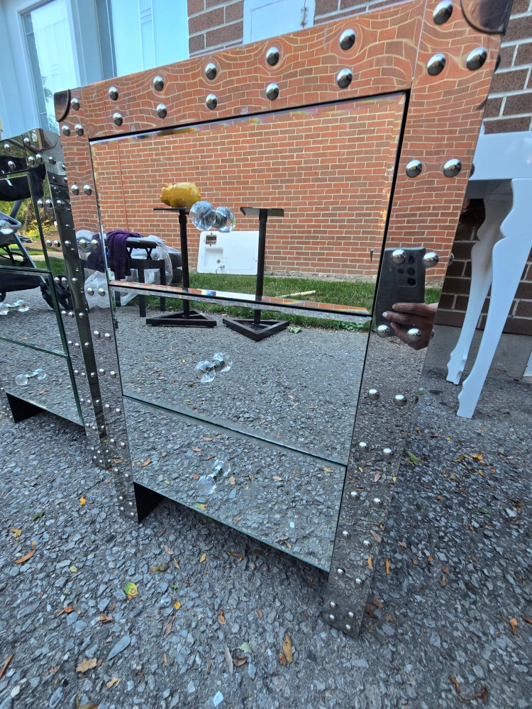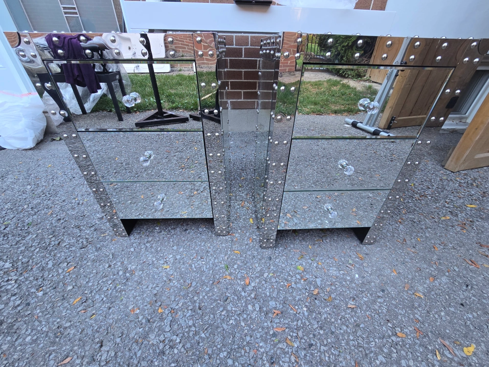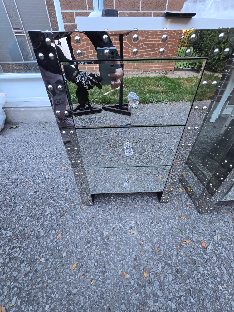 The end table is an essential piece for any shared space. The Azura mirrored contemporary end table offers a sleek, upscale look for any modern interior. Stylishly embellished with mirrored glass finish and nail heads trim on all sides, the Azura offers the perfect touch of elegance and will be a stunning piece to add to your collection. Three spacious drawers line the front with each one fitted with lovely crystal knobs. These provide an understated look while making the drawers accessible. The mirrored finish surfaces and the silver nail heads trim will catch the light beautifully and create a glamorous, sparkling look in your space. $195 each OBO
