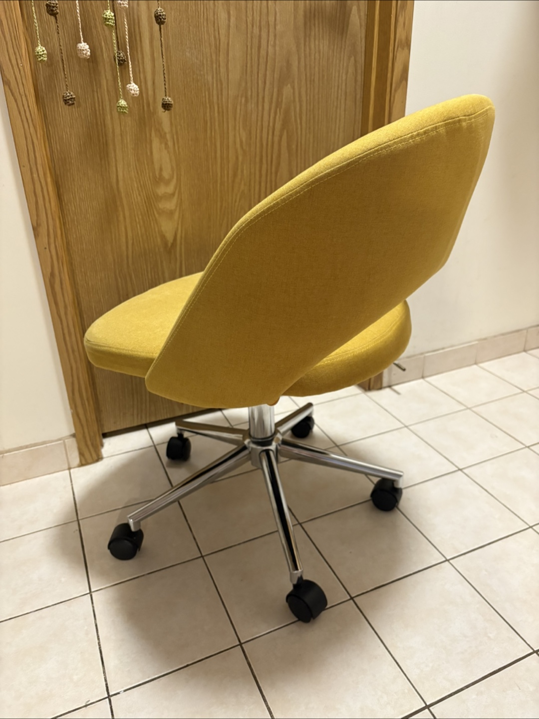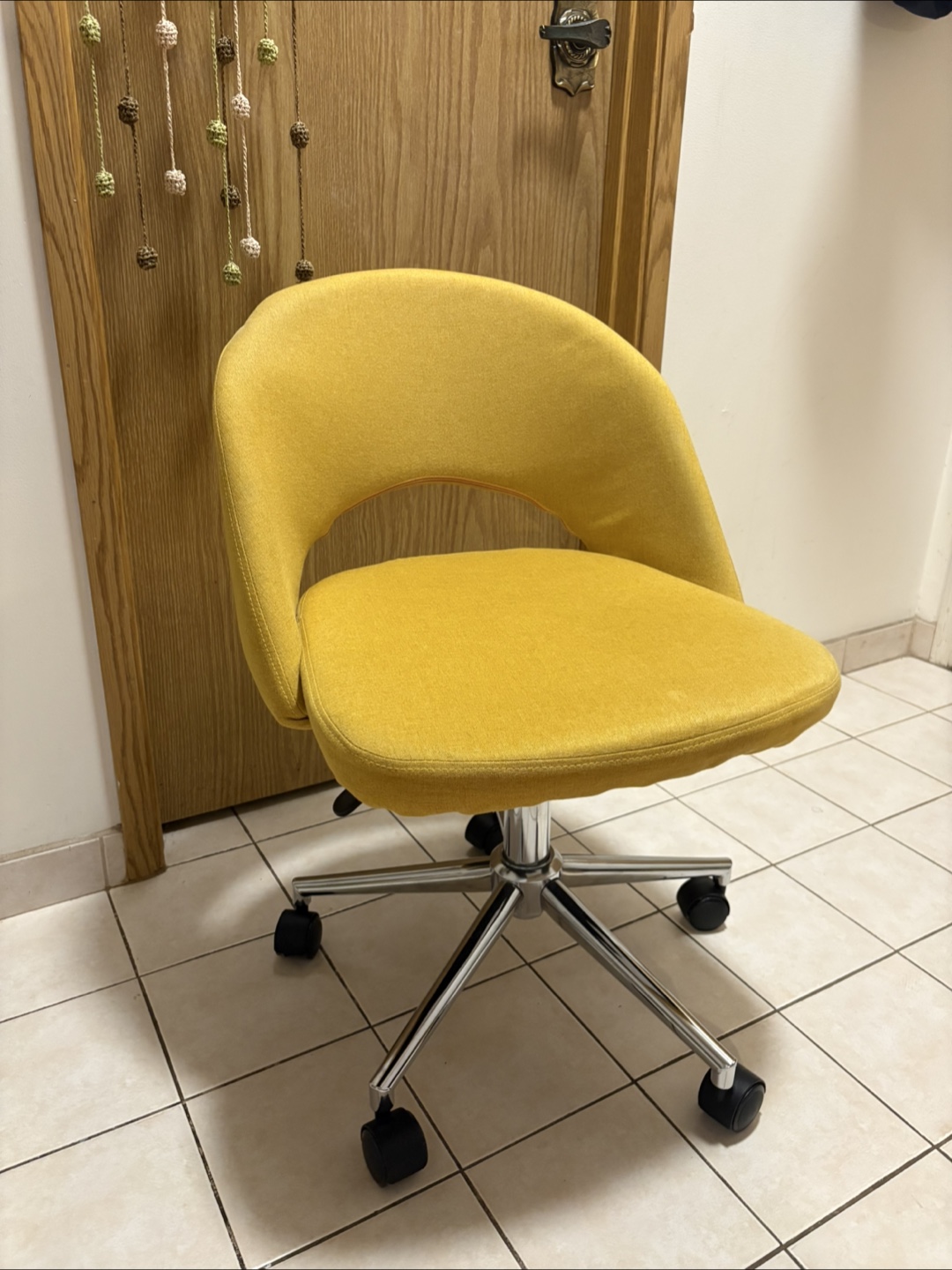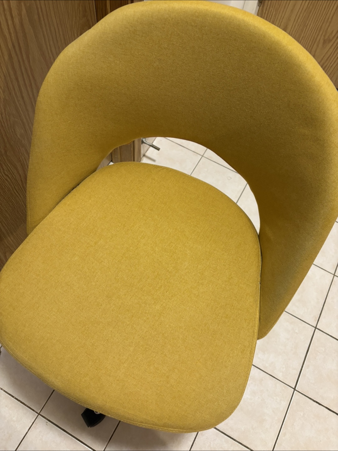 Selling a comfy yellow swivel desk chair! It's in great condition and would be perfect youfor a home office or student space. The chair features a sturdy base with smooth-rolling casters, making it easy to move around your workspace.