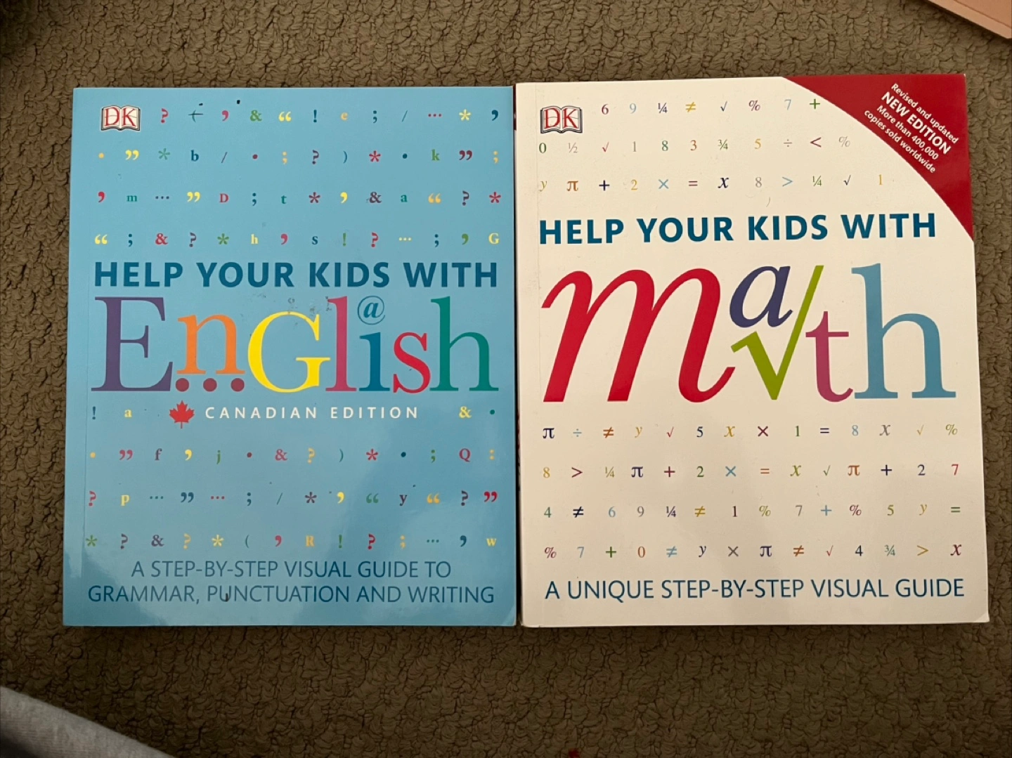 Selling two helpful DK books for kids: "Help Your Kids with English" (Canadian Edition) and "Help Your Kids with Math"! These are step-by-step visual guides to grammar, punctuation, writing, and basic arithmetic, geometry, and algebra. A great resource for parents and kids learning together