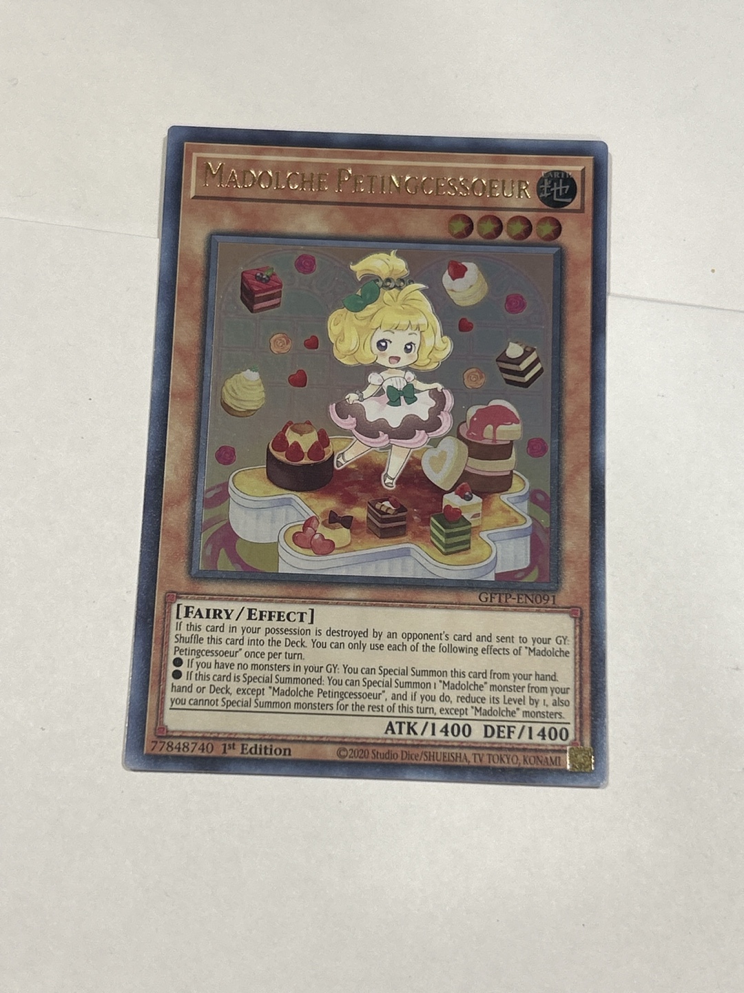 Selling a Madolche Petingcessoeur Yu-Gi-Oh! card. It's in great condition and ready for a new home. This card is a Fairy/Effect monster with 1400 ATK and 1400 DEF. It's a 1st Edition card from 2020!