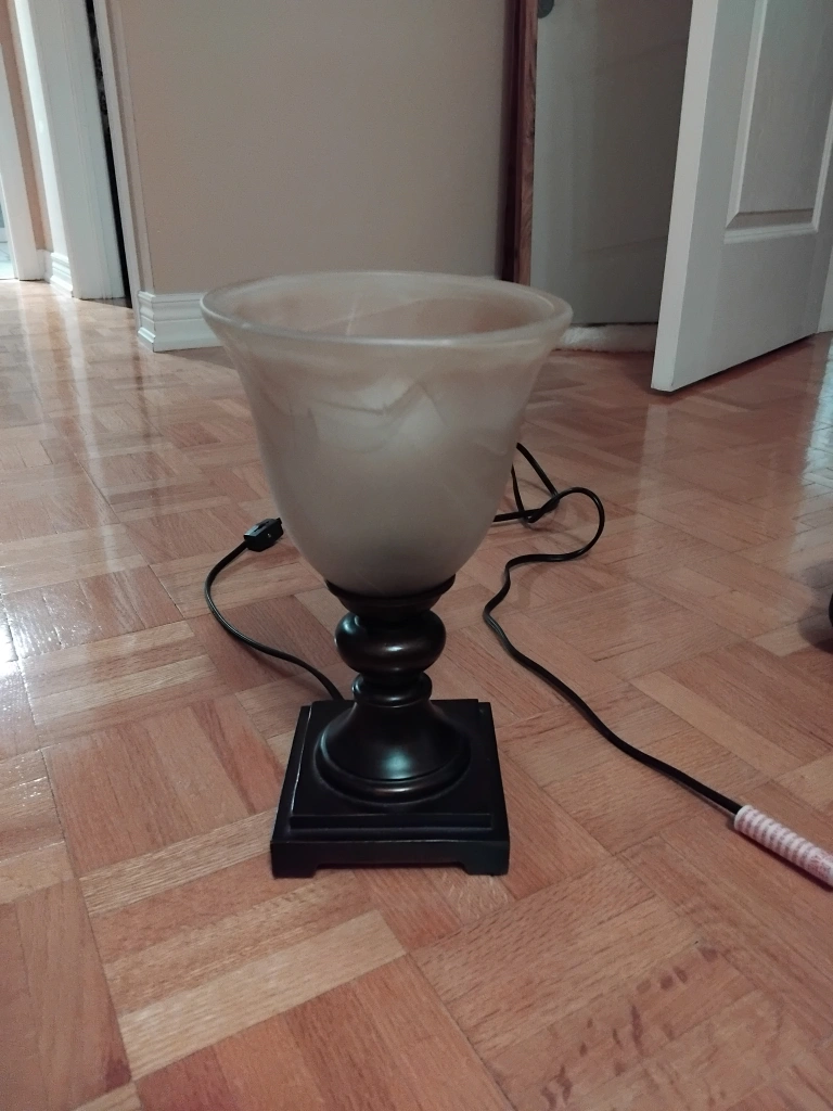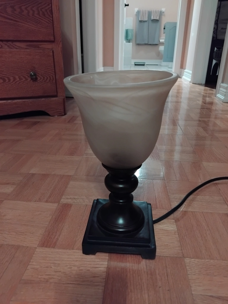 Selling a charming table lamp with a beautiful alabaster-style shade. It features a dark base and a classic design that would look great in any room. It's in good condition and provides a warm, inviting light. Perfect for a bedside table or living room accent!