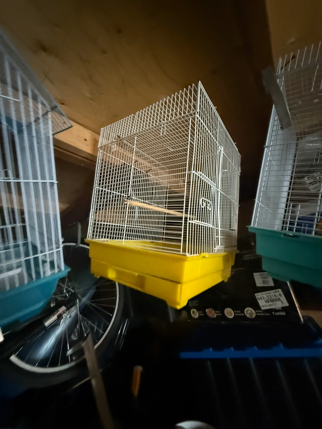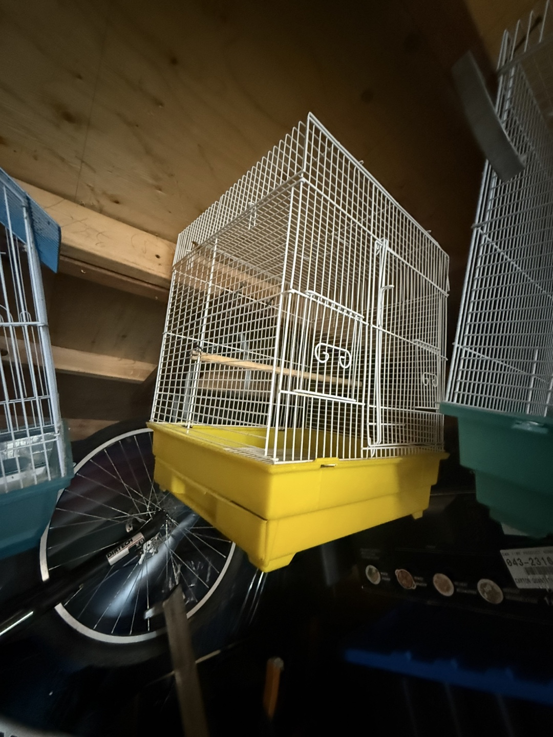 Selling a bird cage with a white wire frame and yellow base. It's in good condition and ready for a new feathered friend