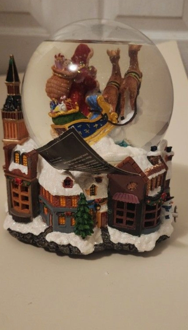 23A charming snow globe featuring Santa in his sleigh being pulled by reindeer over a snowy village scene. The globe is in great condition and ready to add some holiday cheer to your home!