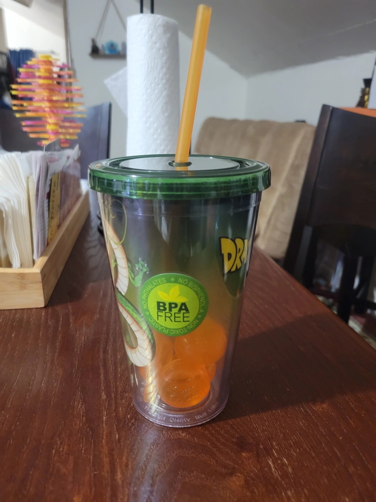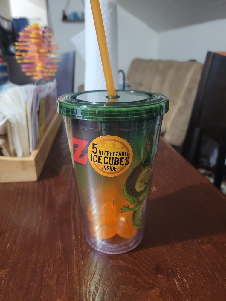 Dragon Ball Z themed cup with a straw and 5 refreezable ice cubes inside! The cup features a design with Shenron and the Dragon Ball Z logo. It's BPA free and made of non-toxic plastic. Got it as a gift never been used