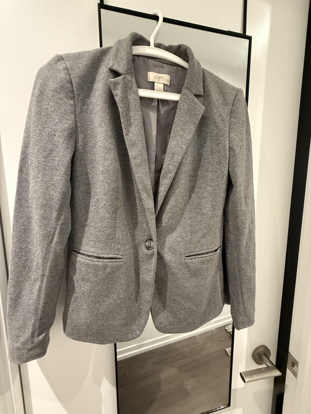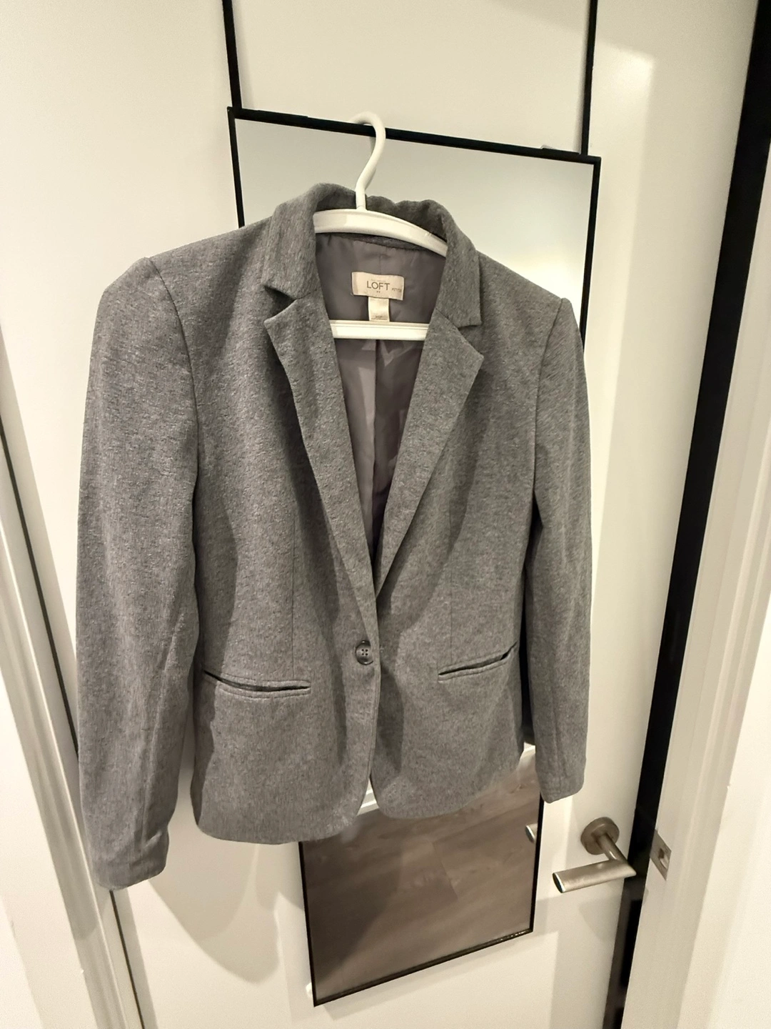 Selling a gently used Loft blazer in a lovely grey colour! It's a size small and made of a comfortable material, perfect for adding a touch of polish to any outfit. It's in great condition and ready for a new home