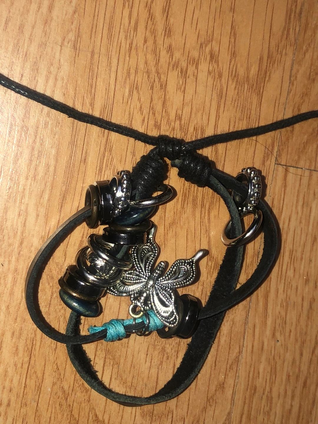 Here's a unique handmade bracelet! It features a butterfly charm and various beads on a black cord. The bracelet has a bohemian style and would be a great addition to your jewelry collection