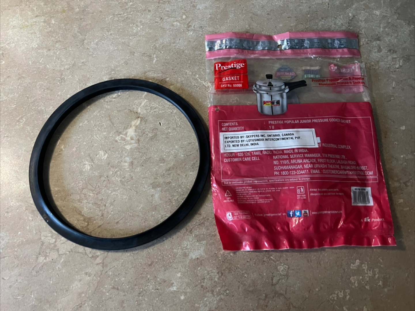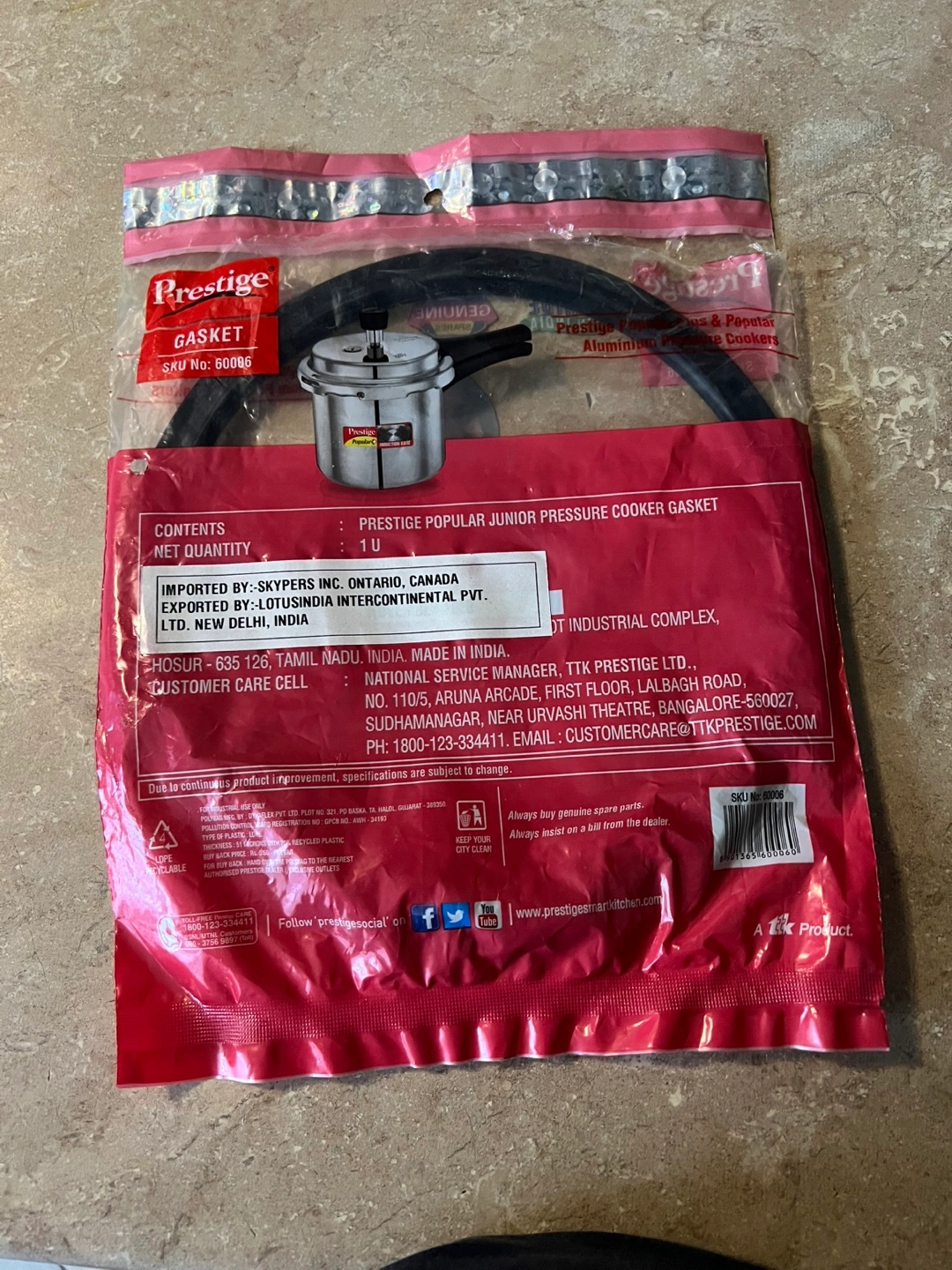 Selling a Prestige Junior Pressure Cooker Gasket. It's made of food-grade nitrile and suitable for Prestige pressure cookers, specifically the 3, 5, and 6.6-litre aluminum cookers. The SKU number is 50086. Always buy genuine spare parts!
