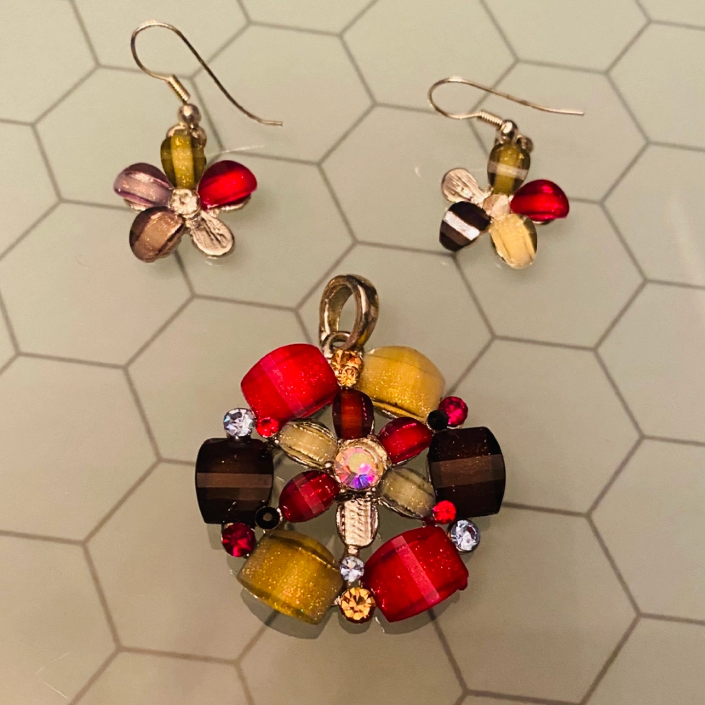 This pretty pendant and earrings set features a colourful design with red, yellow, and brown beads, along with a few rhinestones. Perfect for adding a pop of colour to any outfit. *Note there is one stone missing from each piece, it’s hard to see it though!