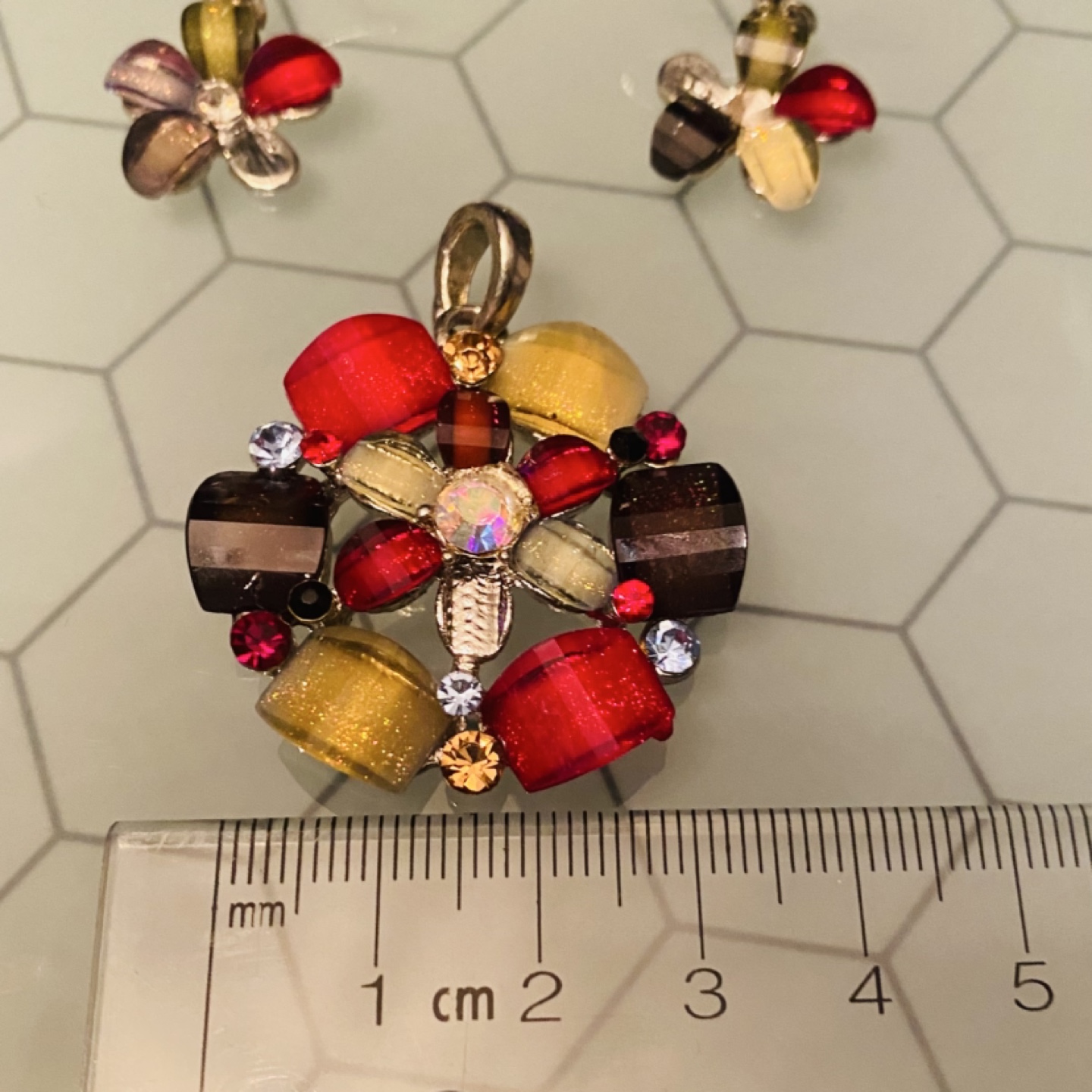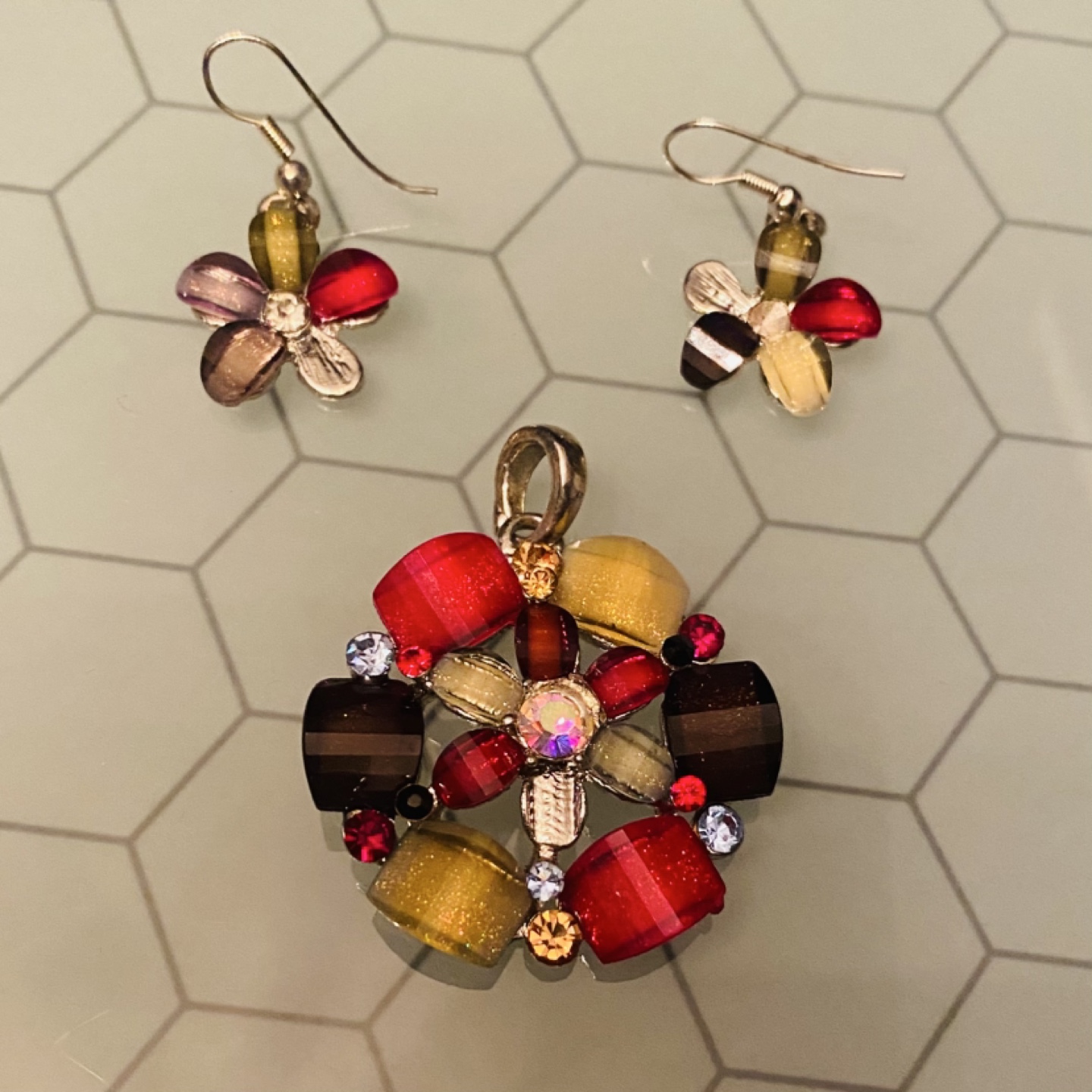 This pretty pendant and earrings set features a colourful design with red, yellow, and brown beads, along with a few rhinestones. Perfect for adding a pop of colour to any outfit. *Note there is one stone missing from each piece, it’s hard to see it though!