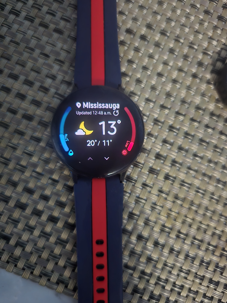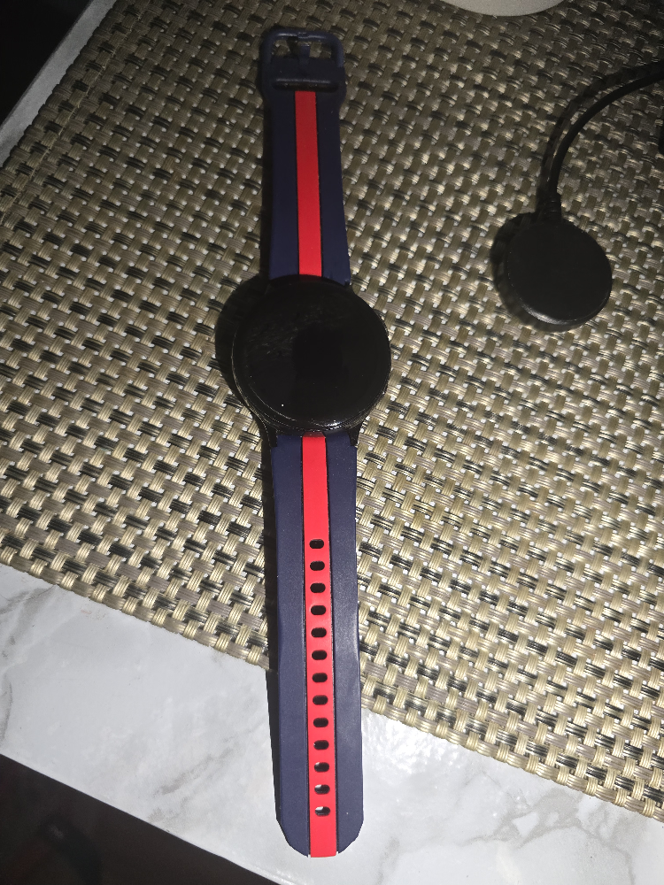 Selling a Samsung Galaxy Watch Active 2. It's in great condition and comes with a charger. The band is a stylish navy blue with red accents. It's a great smartwatch for fitness tracking and everyday use! wear few times only