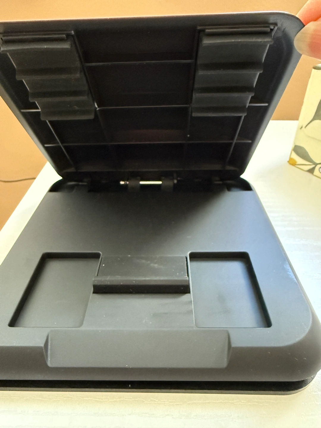 black phone stand. good condition, ready to hold your phone sideways securely. Perfect for hands-free watching where you can secure it onto a table top and enjoy your favorite show!!!