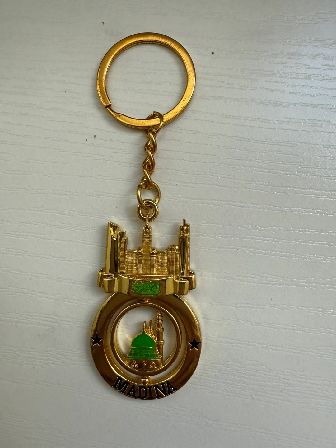 A nice Madina keychain with a gold finish. It features a detailed design of the city's skyline and landmarks. Perfect for adding a touch of culture to your keys or bag. Brand new.