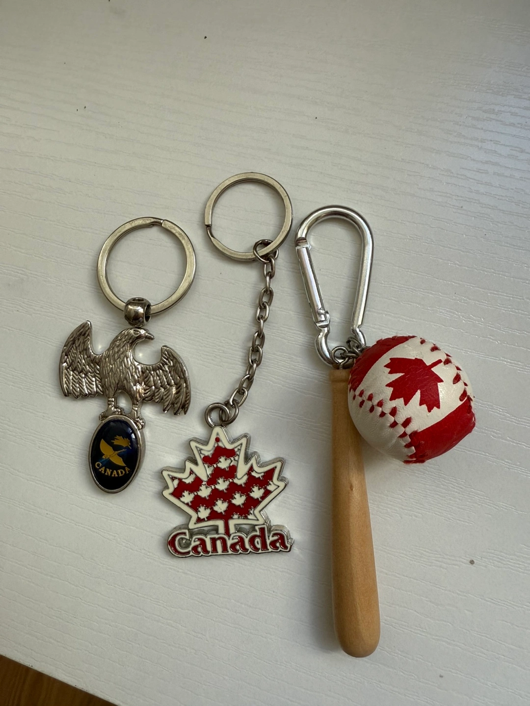 three Canada-themed keychains! You'll get an eagle keychain, a maple leaf keychain, and a baseball bat and ball keychain with a maple leaf design.