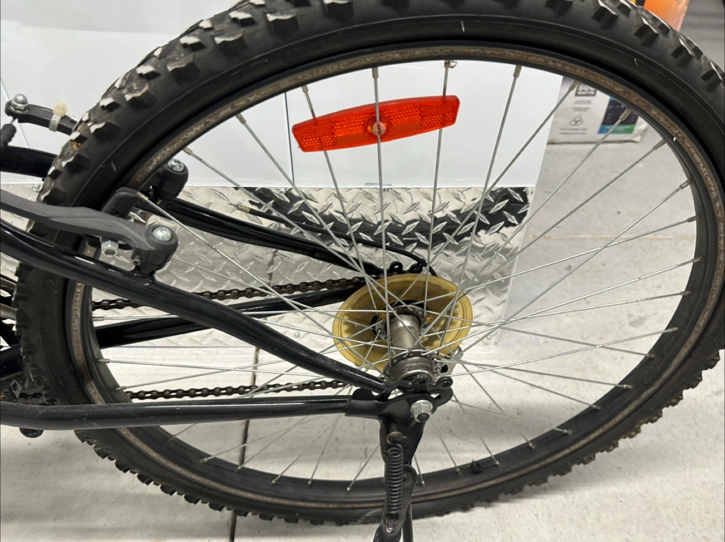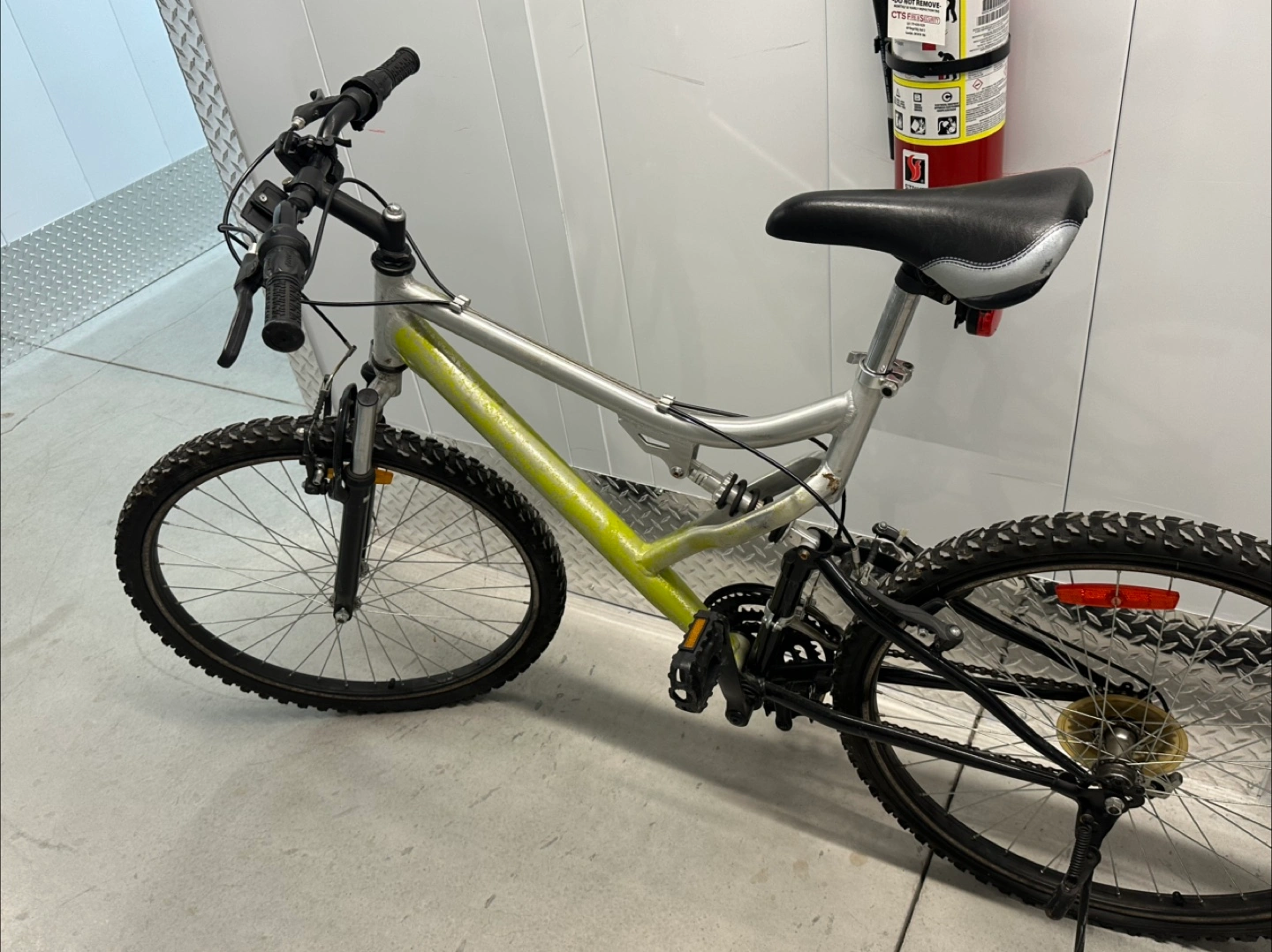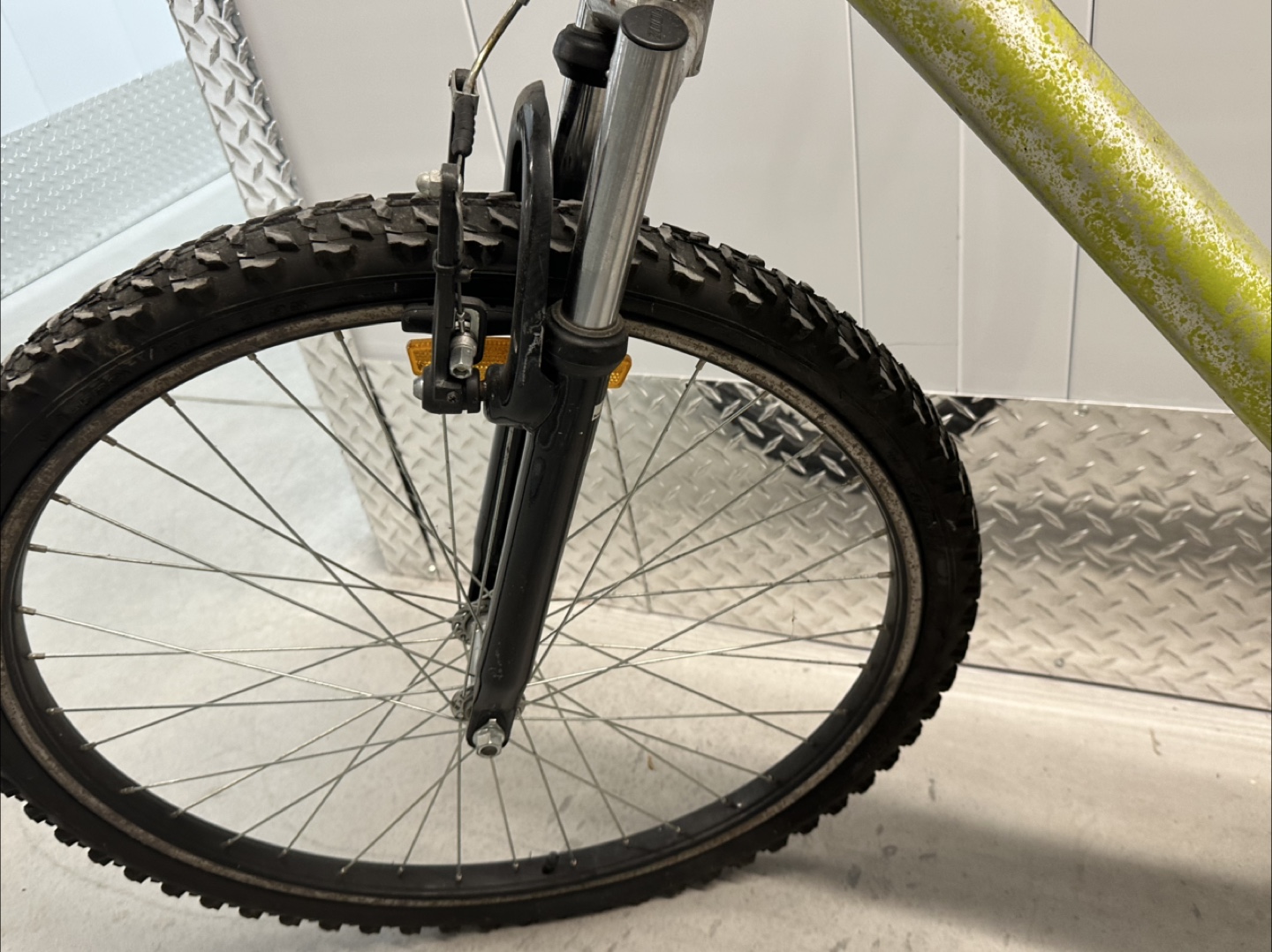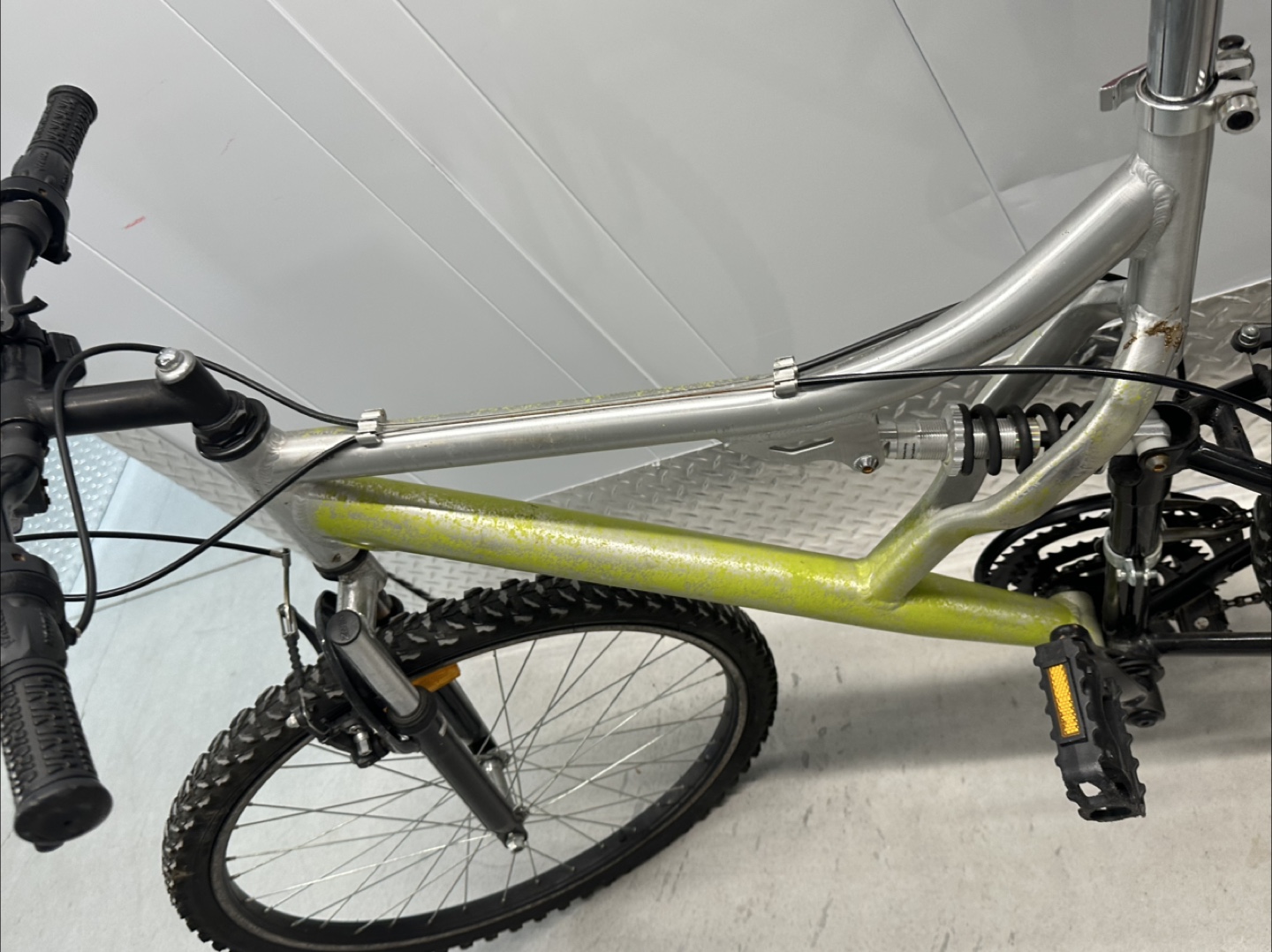 Selling a mountain bike with a silver and green frame. It shows some signs of wear and tear, and needs new brakes